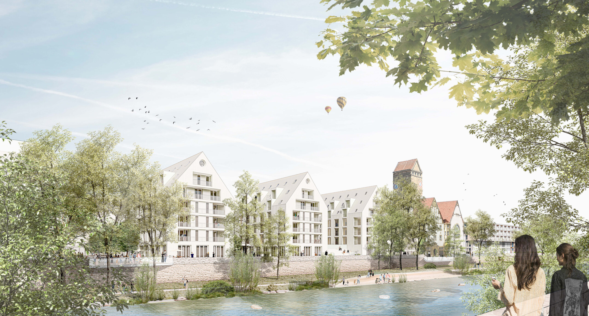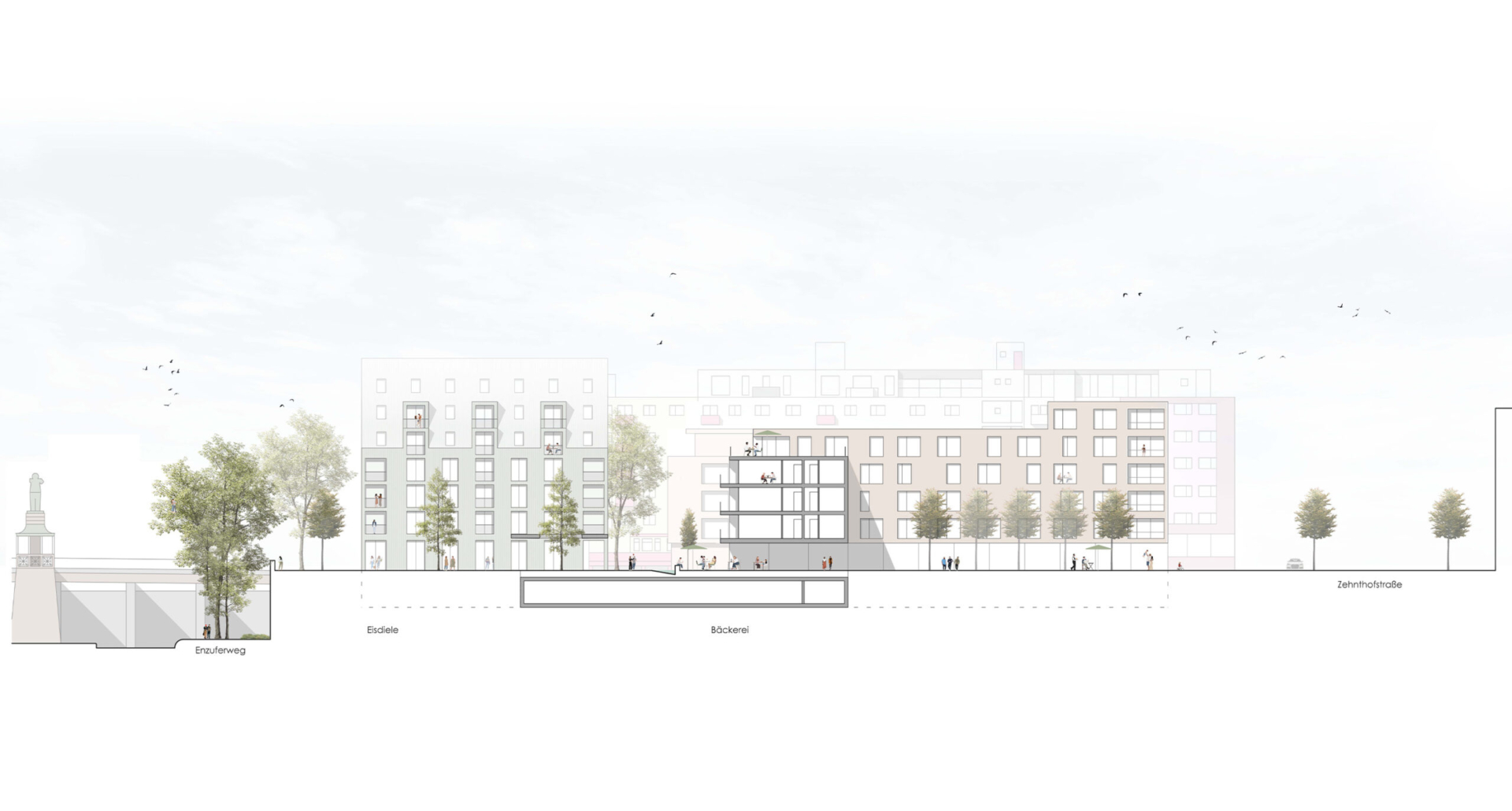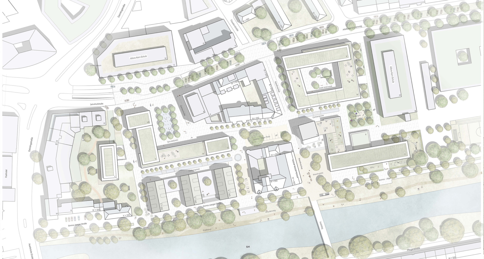 Über die gesamte Areallänge ist die grüne Flusslandschaft der Enz das städtebaulich prägende Element. Dieses Element soll möglichst tief in das Areal bis zum Altstädter Kirchenweg eindringen. Der Übergang vom Campuscharakter im Osten hin zum geschlossenen Baublock im Westen erfolgt kontinuierlich mittels modifizierter Straßen- und Platzräume, welche sich vom großformatigen Außenraum hin zu intimen Plätzen und Gassen wandeln. Hierdurch entsteht im Ideenteil ein Quartier mit Hinweis auf die historischen Gerberhäuser, die kleine Gerberstrasse und den Gerberbach, welche vor der Zerstörung dieses Viertel prägten. Im Realisierungsbereich antwortet ein Mixed-Use-Gebäude mit auf sein Gegenüber mit ähnlicher Hoftypologie und vermittelt zum östlich angrenzenden Campus. Zwei mäanderförmige Zeilen schlängeln sich in West-Ost Richtung durch Ideen- und Realisierungsbereich und verbinden diese mittels zeitgenössischer Architektursprache zu einem Gesamtareal. Zwischen den beiden Gebäuden wird der historische Platz auf der ehemaligen Insel neu definiert und macht das Emma-Jäger-Gebäude zur eigentlichen Quartiersmitte. Über zahlreiche Blick- und Wegebeziehungen, sowohl in Nord-Süd Richtung zur Enz, als auch in arealverbindender West-Ost Richtung entsteht eine spannungsreiche Vernetzung, welche die angrenzenden Quartiere miteinschließt und somit traditionelle urbane Außenräume bis hin zur Campusatmosphäre erlebbar macht.