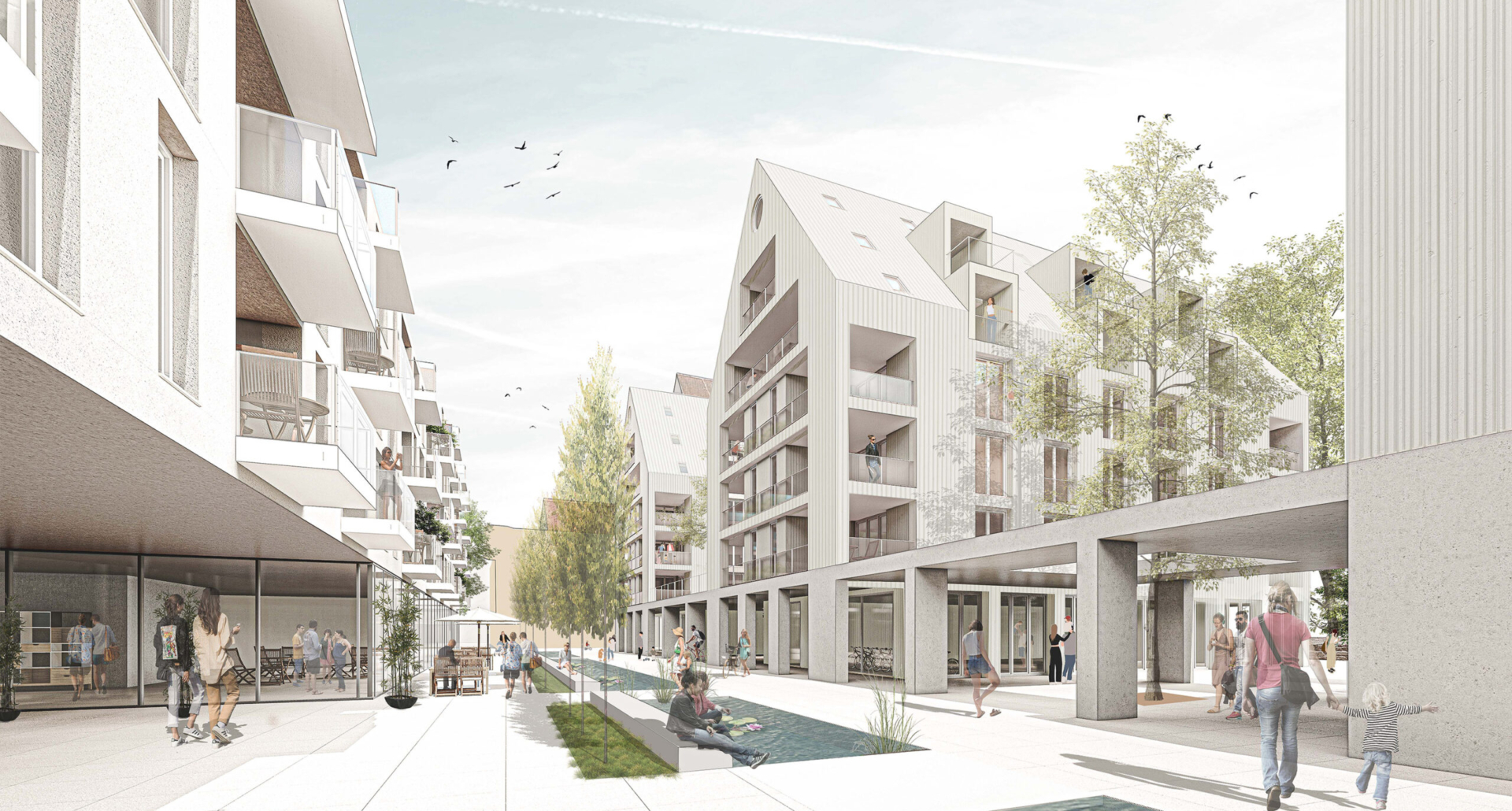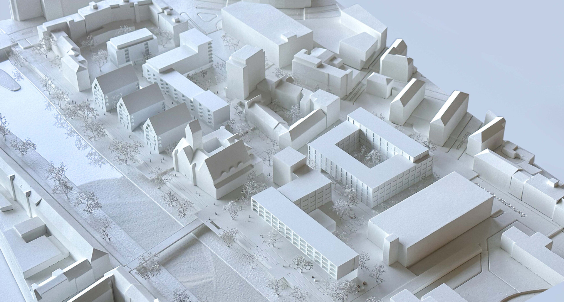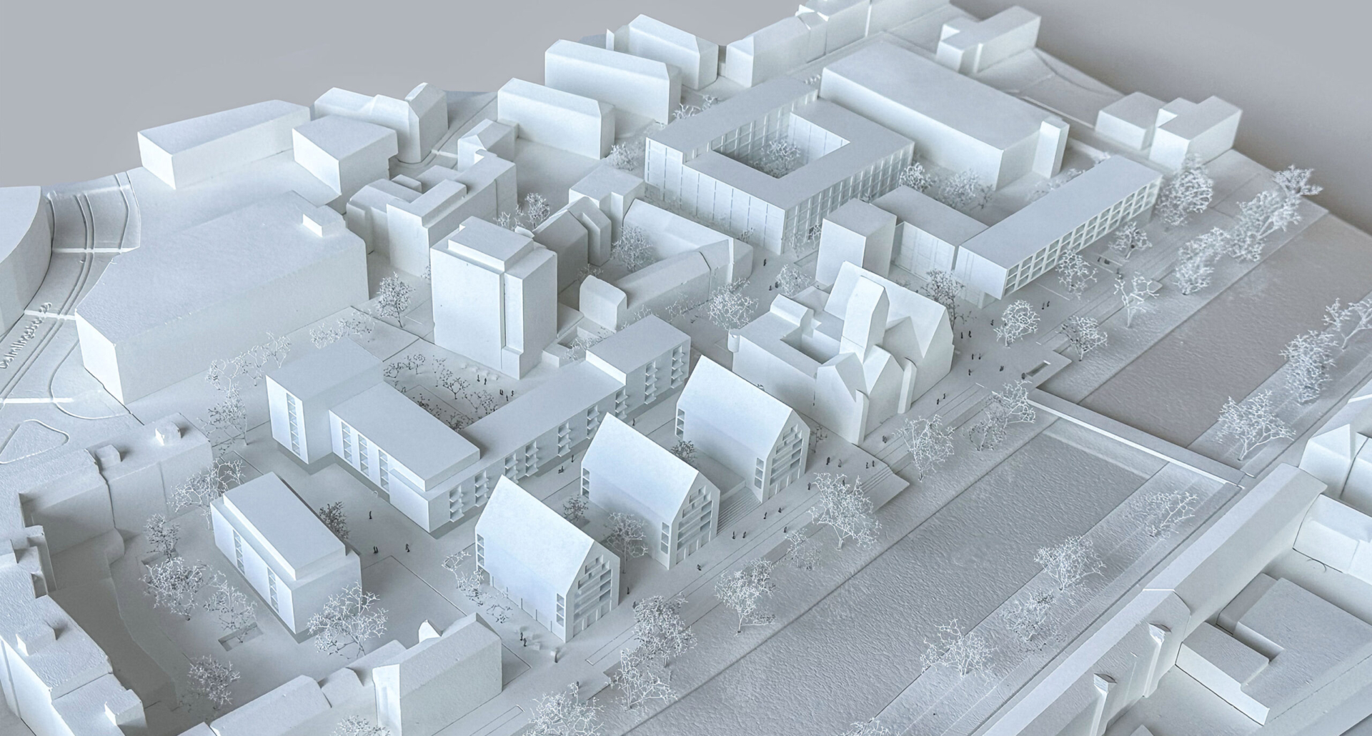 Über die gesamte Areallänge ist die grüne Flusslandschaft der Enz das städtebaulich prägende Element. Dieses Element soll möglichst tief in das Areal bis zum Altstädter Kirchenweg eindringen. Der Übergang vom Campuscharakter im Osten hin zum geschlossenen Baublock im Westen erfolgt kontinuierlich mittels modifizierter Straßen- und Platzräume, welche sich vom großformatigen Außenraum hin zu intimen Plätzen und Gassen wandeln. Hierdurch entsteht im Ideenteil ein Quartier mit Hinweis auf die historischen Gerberhäuser, die kleine Gerberstrasse und den Gerberbach, welche vor der Zerstörung dieses Viertel prägten. Im Realisierungsbereich antwortet ein Mixed-Use-Gebäude mit auf sein Gegenüber mit ähnlicher Hoftypologie und vermittelt zum östlich angrenzenden Campus. Zwei mäanderförmige Zeilen schlängeln sich in West-Ost Richtung durch Ideen- und Realisierungsbereich und verbinden diese mittels zeitgenössischer Architektursprache zu einem Gesamtareal. Zwischen den beiden Gebäuden wird der historische Platz auf der ehemaligen Insel neu definiert und macht das Emma-Jäger-Gebäude zur eigentlichen Quartiersmitte. Über zahlreiche Blick- und Wegebeziehungen, sowohl in Nord-Süd Richtung zur Enz, als auch in arealverbindender West-Ost Richtung entsteht eine spannungsreiche Vernetzung, welche die angrenzenden Quartiere miteinschließt und somit traditionelle urbane Außenräume bis hin zur Campusatmosphäre erlebbar macht.