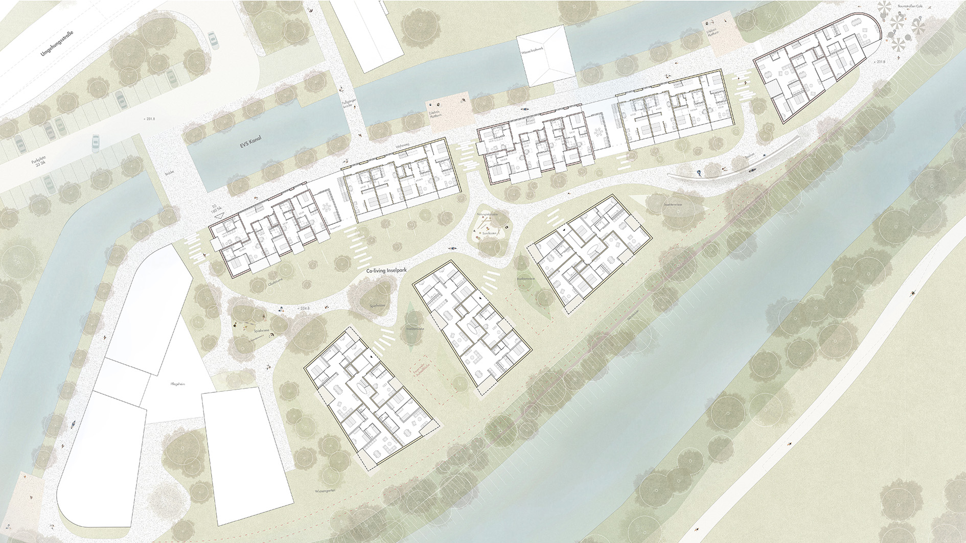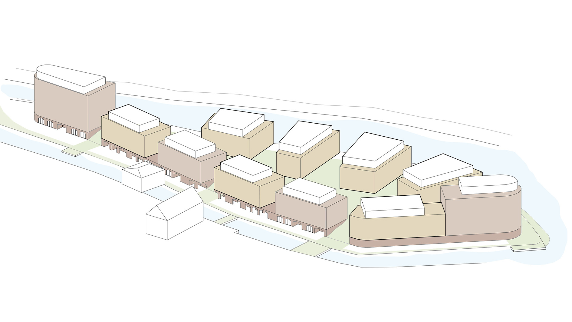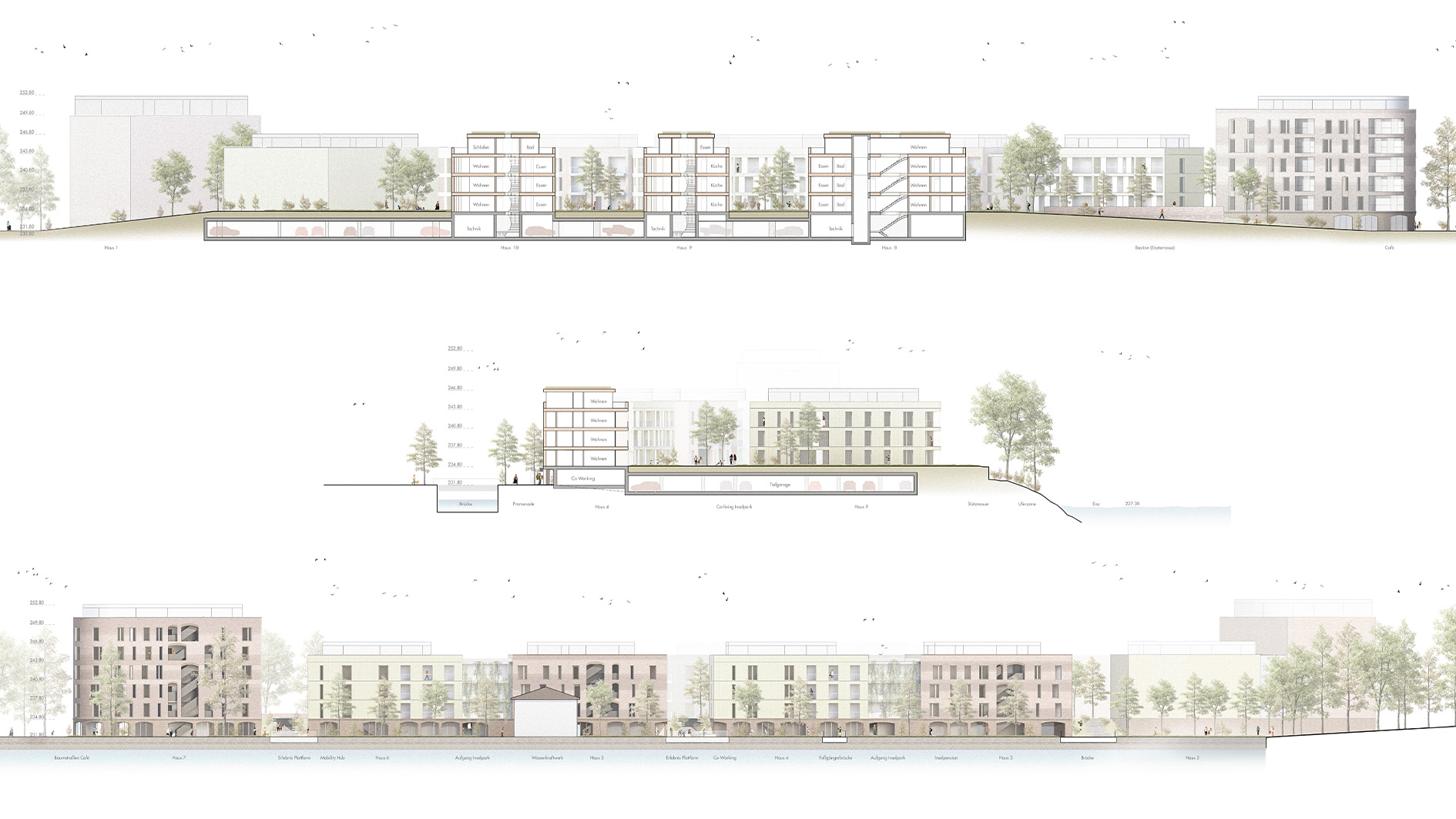 Ein schlanker Baukörper vermittelt zwischen Straßenniveau Alarmausfahrt und einer zwischen Bahndamm und Gebäude höher liegenden Freifläche, welche für die öffentlichen Nutzungen im Obergeschoß als Aufenthaltsbereich im Freien dient. Zur Ortschaft hin bildet der Übungsturm einen vertikalen Abschluss des Bauvolumens. Im direkten Anschluss und Zuordnung zum Übungsturm befindet sich nördlich die Übungsfläche der Feuerwehr, welche nicht unter der Sicherheitszone der Oberleitungen liegen darf. Der mit Holz verkleidete Hybridbaukörper soll als skulpturales schnörkelloses Volumen in seiner Einfachheit als Baustein am Ortseingang überzeugen.