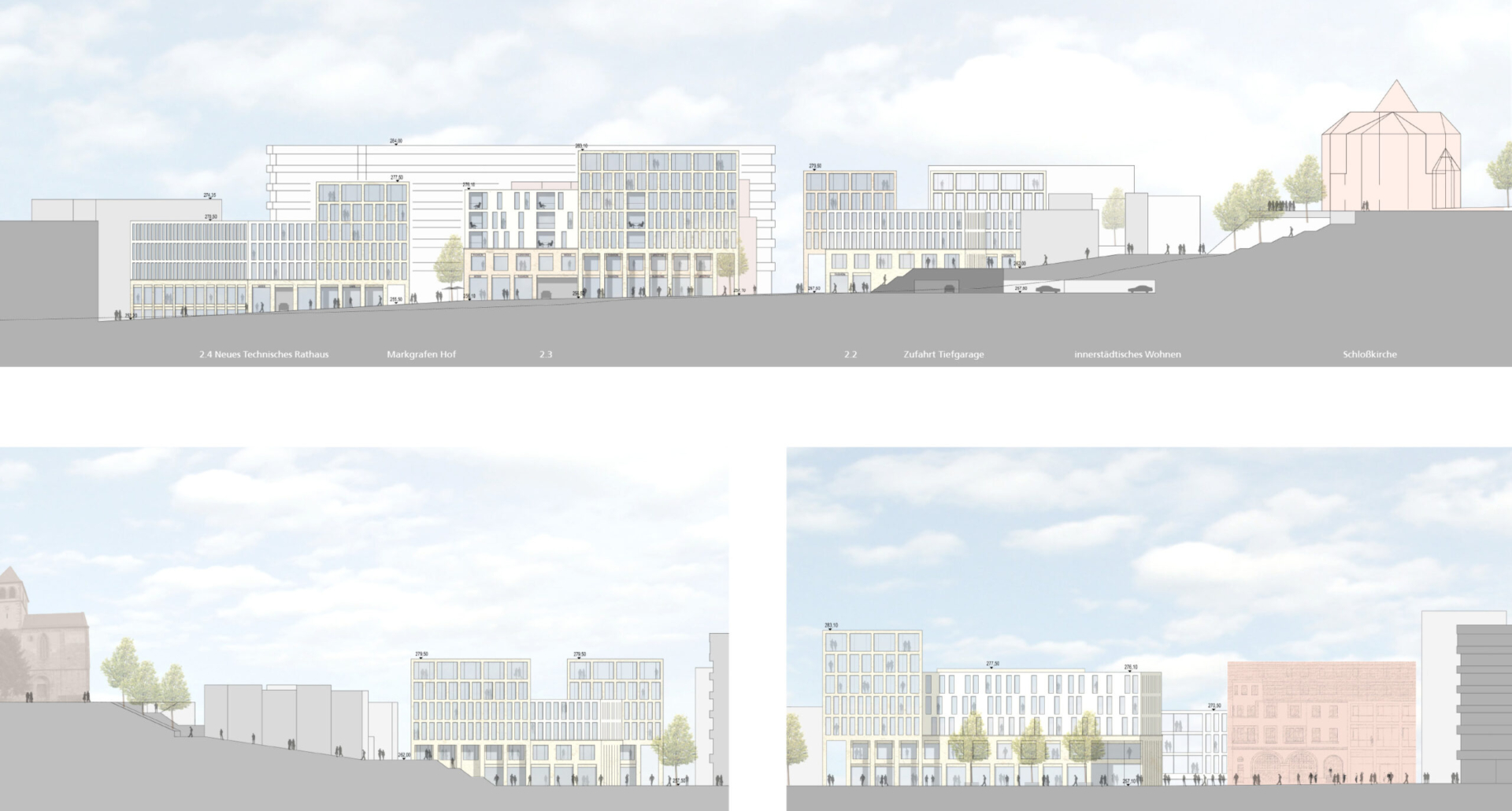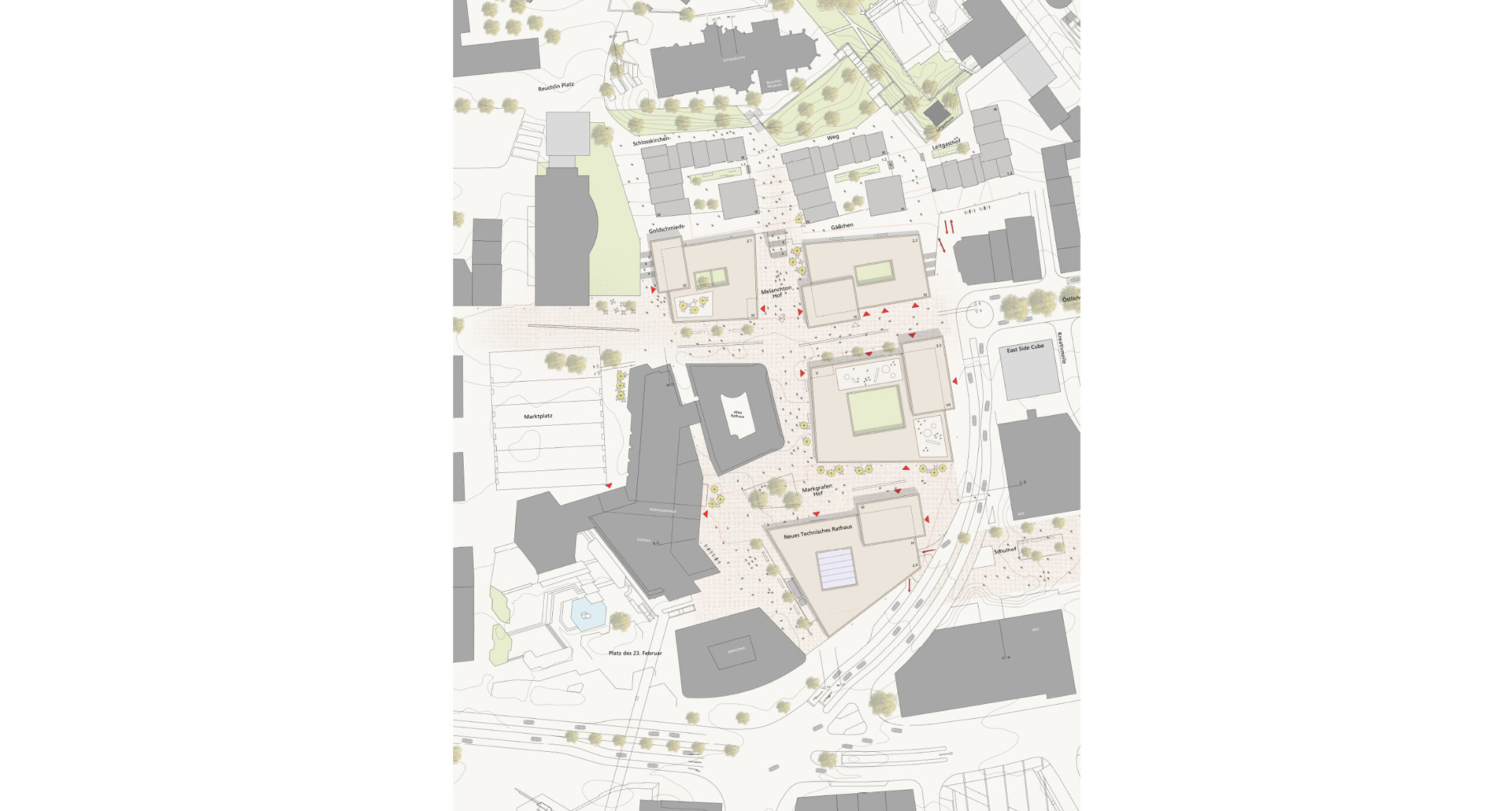Die Volumen der Bausteine übernehmen die vorhandene Körnung und bieten dem Stadtbesucher durch Fortführung der bekannten Blockgrößen maßstäbliche  Passanten- und Schaufensterumläufe. Das Neue Rathaus sperrt den Zugang zum südlichen Vorplatz des historischen Alten Rathauses und verdreifacht die gewohnte Streckenlänge. Aus diesem Grund erhält das Neue Rathaus eine attraktive Passage, welche neben der Anbindung an das neue Quartier auch den Rathauszugang an der südöstlichen Ecke des Marktplatzes städtebaulich betont.