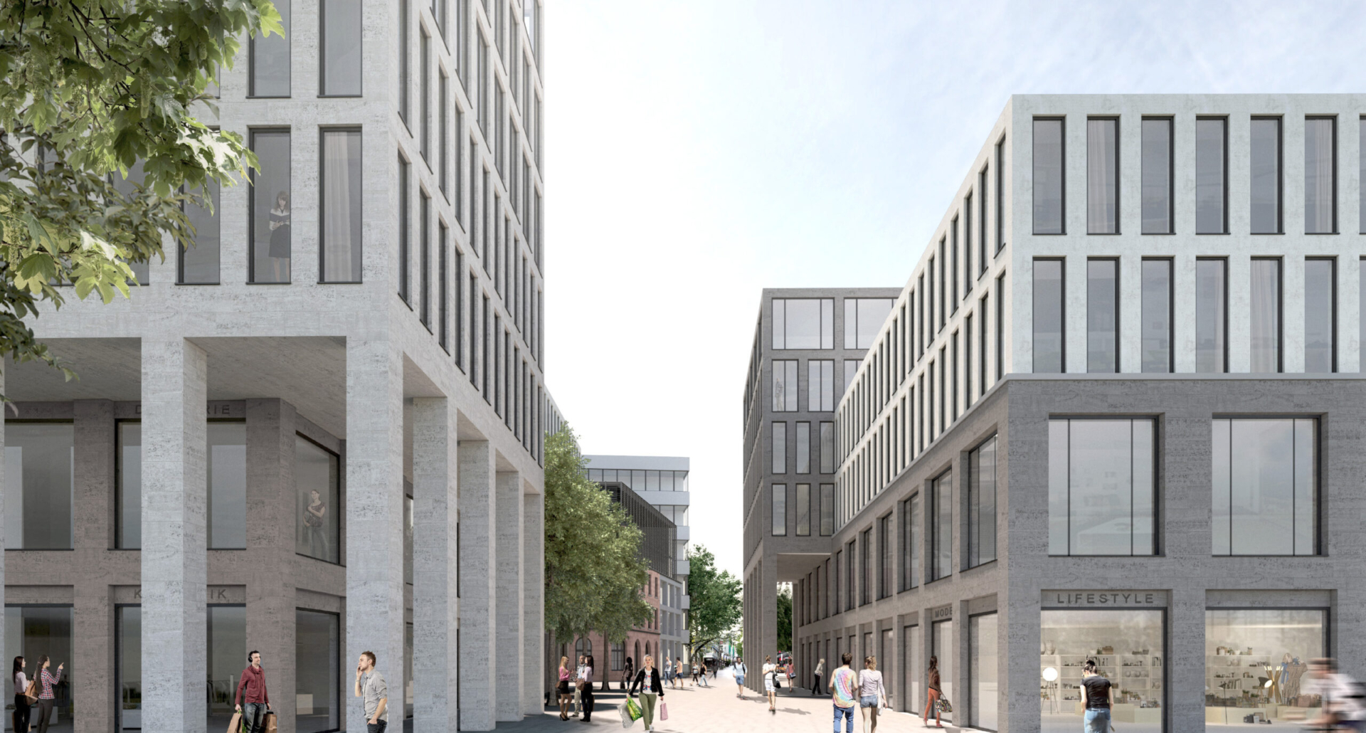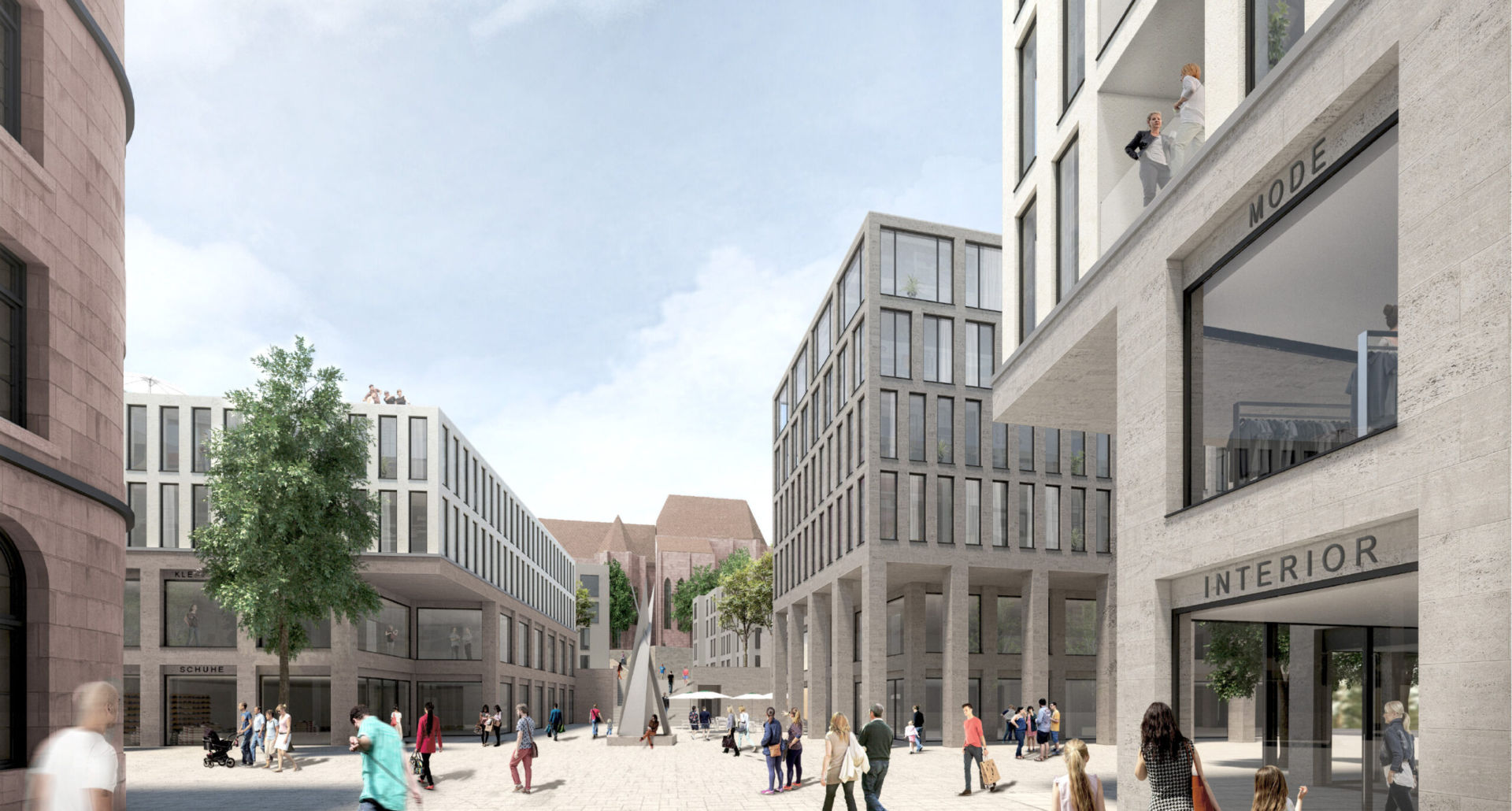 Die Idee ist das Ensemble in Form eines durchmischten innerstädtischen Quartiers mit traditionellen Straßenräumen und spannungsvollen Platzfolgen neu entstehen zu lassen, die „Badischen Höfe“. Die heterogene 50-er Jahre Bebauung der Innenstadt wird im Osten durch fünf markante Stadtbausteine ergänzt, deren Skyline in der Fernwirkung ein Signet eines lebendigen modernen Handelsquartiers darstellt. Variationen einer einzigen starken Typologie erzeugen zusammenhängenden Quartierscharakter und erlebnisreiche Raumfolgen zugleich.