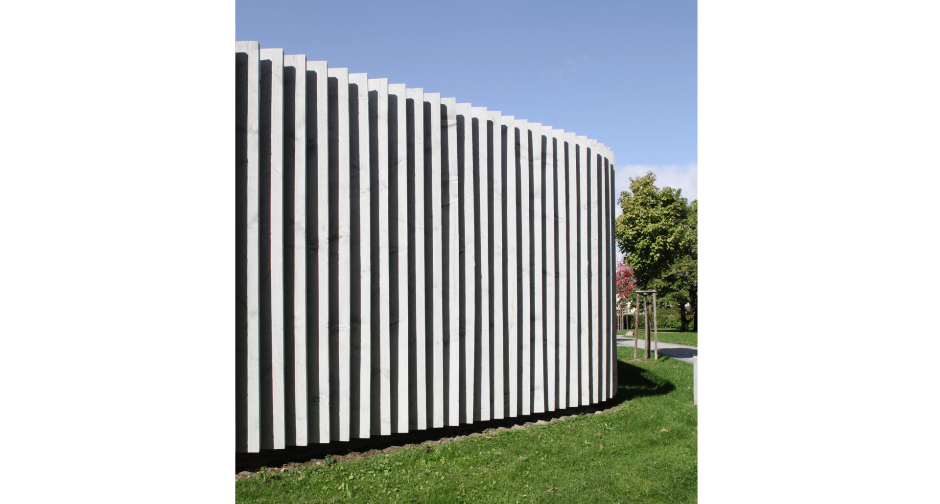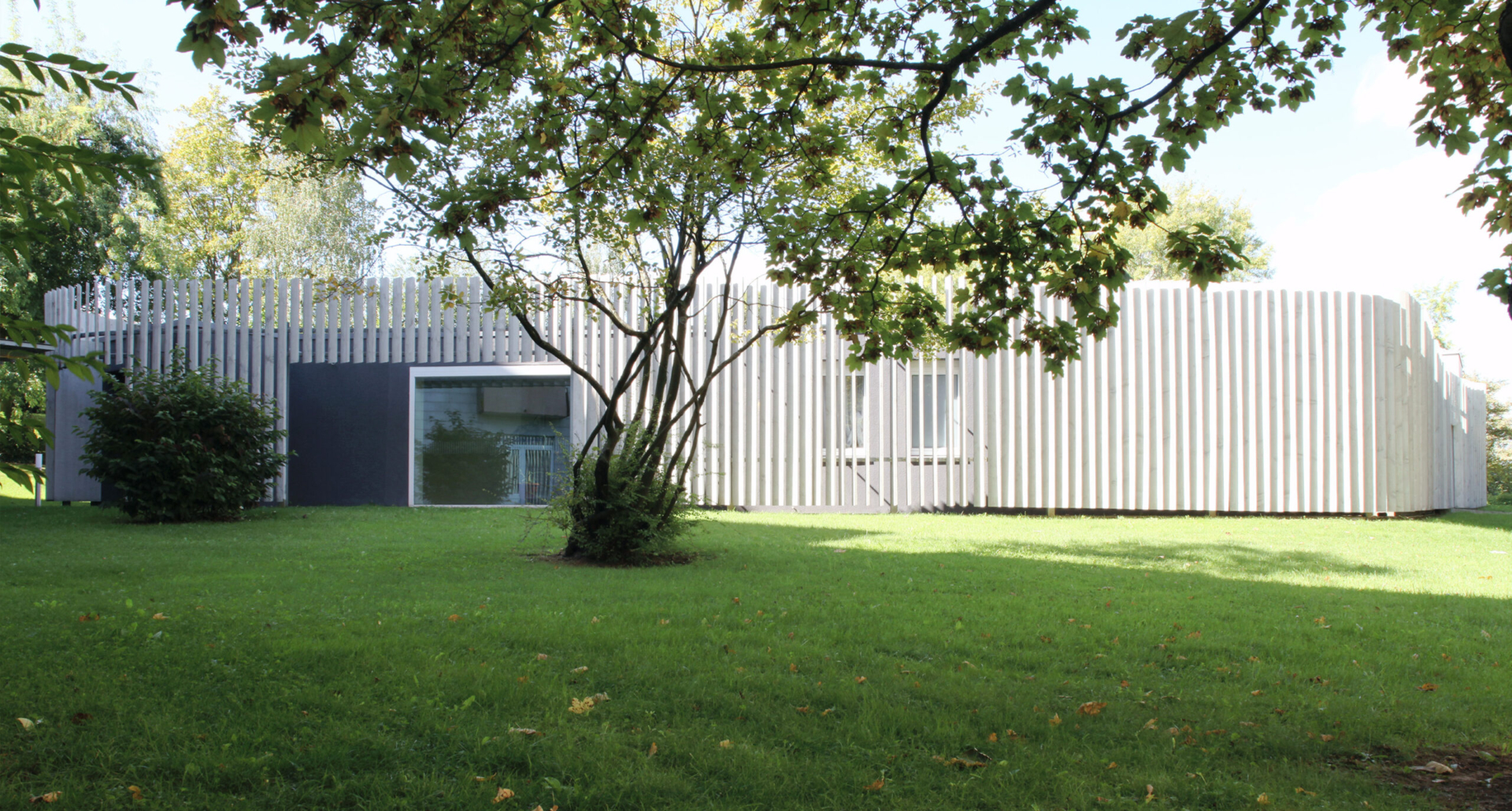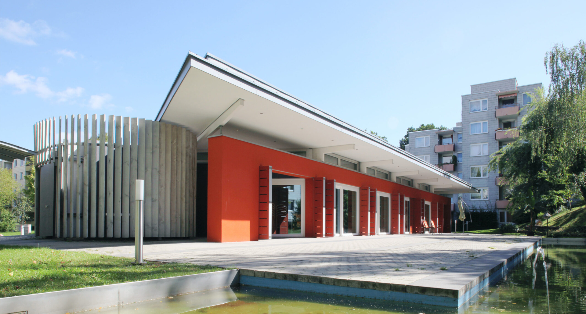 Die vor dem alten Gebäudevolumen positionierte transparente Fassadenschicht gibt der Begegnungsstätte ihre neue Identität. Eine im Grundriss organisch verlaufende Linie aus vertikalen Douglasienbrettern schafft über Form und Material die Verbindung zur Natur. Das Dach des Saales wurde nach Süden verbreitert, so dass mit dem neu geschaffenen Wasserbecken ein großzügiger Terrassenbereich zum Verweilen einlädt. Türkisfarbenes Wasser und eine rote Wandscheibe, deren Faltläden das Licht des Veranstaltungssaals filtern, charakterisieren den neuen Freibereich der Besucher.