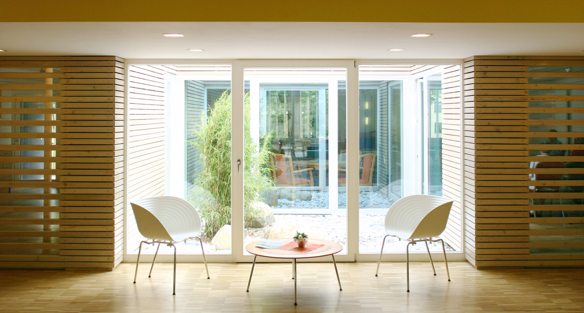 Im Gebäudeinnern wird der bestehende Innenhof zu einem Aufenthaltsbereich mit Sitzgruppe geöffnet. Dieser neu geschaffene Treffpunkt, an welchem sich auch die Briefkästen für die umgebenden Wohnungen befinden, erhält somit Tageslicht und Sichtverbindung zu Tagespflege und Veranstaltungssaal über transparent gestaltete Eingangselemente.