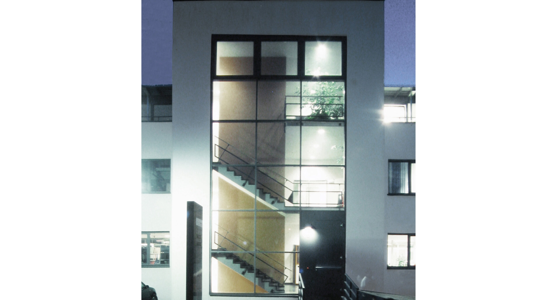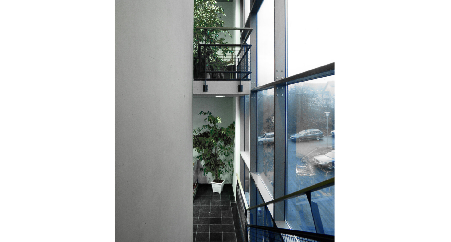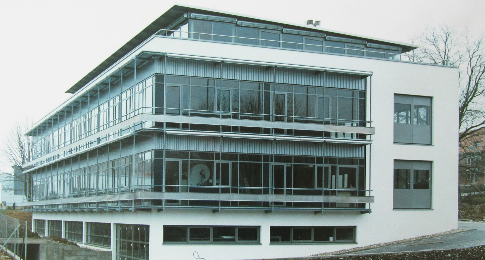 Die konträren Wandausbildungen entsprechen den funktionalen Erfordernissen. Einzelne Fensteröffnungen im Norden erlauben eine variable Büronutzung. Im Süden erzeugt die großflächige Verglasung ein Maximum an Helligkeit für die überwiegend feinmechanischen Arbeiten. Diese Polarität wird durch transparente Trennwände innenräumlich erlebbar.