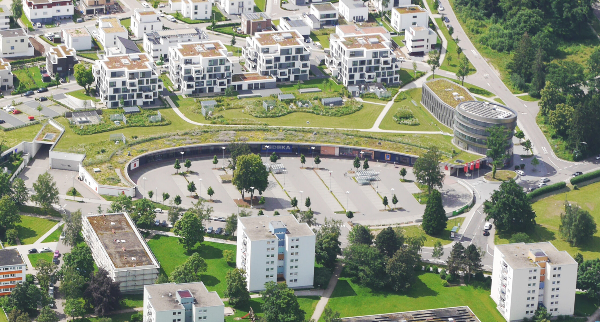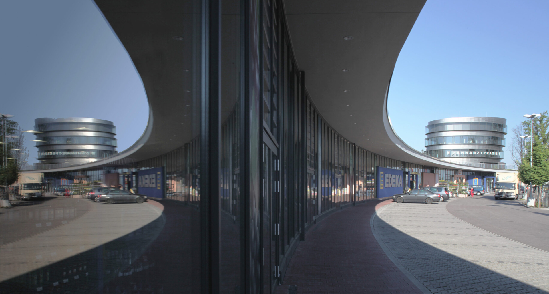 Das Einkaufszentrum bildet den kommerziellen Mittelpunkt der bestehenden Stadteile Buckenberg und Haidach sowie des neu konzipierten Wohnquartiers tiergarten. Der Überschrift des neuen Areals „Wohnen in der Natur“ folgend, wurde der Baukörper in das bestehende Gelände so eingegraben, dass nur eine Fassade in Erscheinung tritt. Der topographische Geländeversprung egalisiert unansehnliche Seiten- und Rückfassaden und erlaubt die Fortführung der leicht geneigten Hangsituation in Form eines intensiv begrünten Daches, über welches die öffentlichen Wegeverbindungen in das Wohnquartier führen. Die geschwungene Glasfassade ergänzt die elliptische Grundrissform der Parkierung und zeigt bei Nacht eine hell erleuchtete Warenausstellung. Bei Tag besteht durch die transparente Haut eine Blickbeziehung zur begrünten Stellplatzfläche. Die Anlieferung erfolgt über einen Zufahrtstunnel unter dem Gründach, so dass keine Störungen in das Wohngebiet ausstrahlen. Der Markt wurde 2011 als bester Edeka Markt Deutschlands ausgezeichnet.
