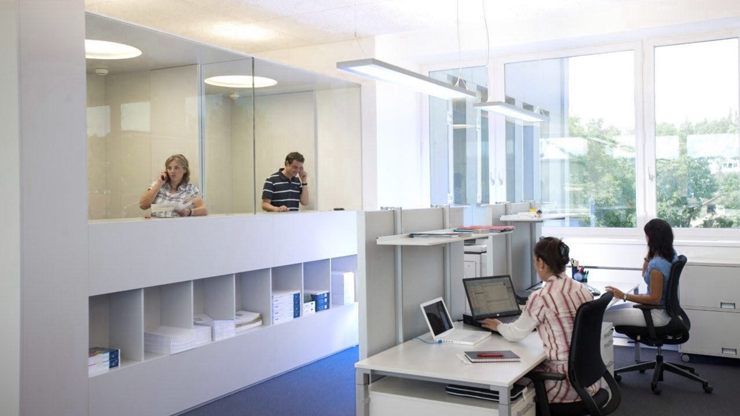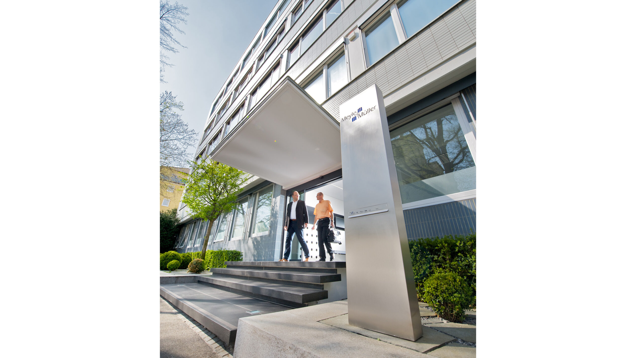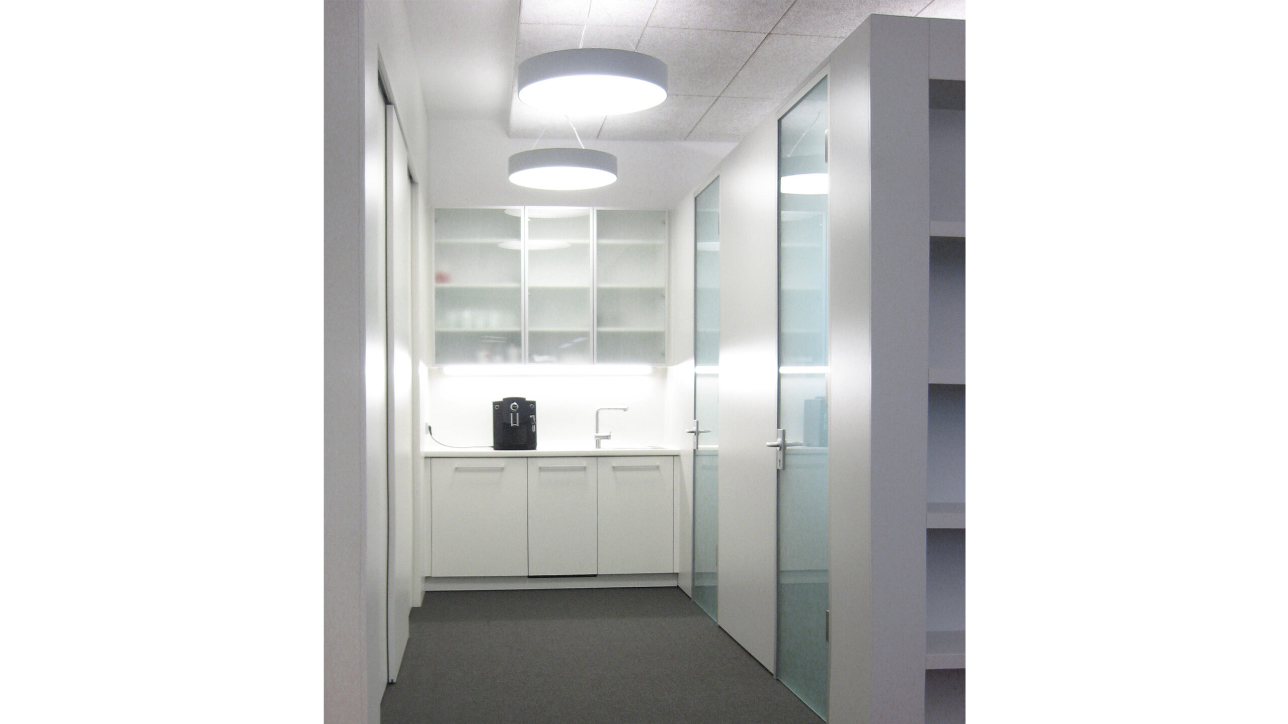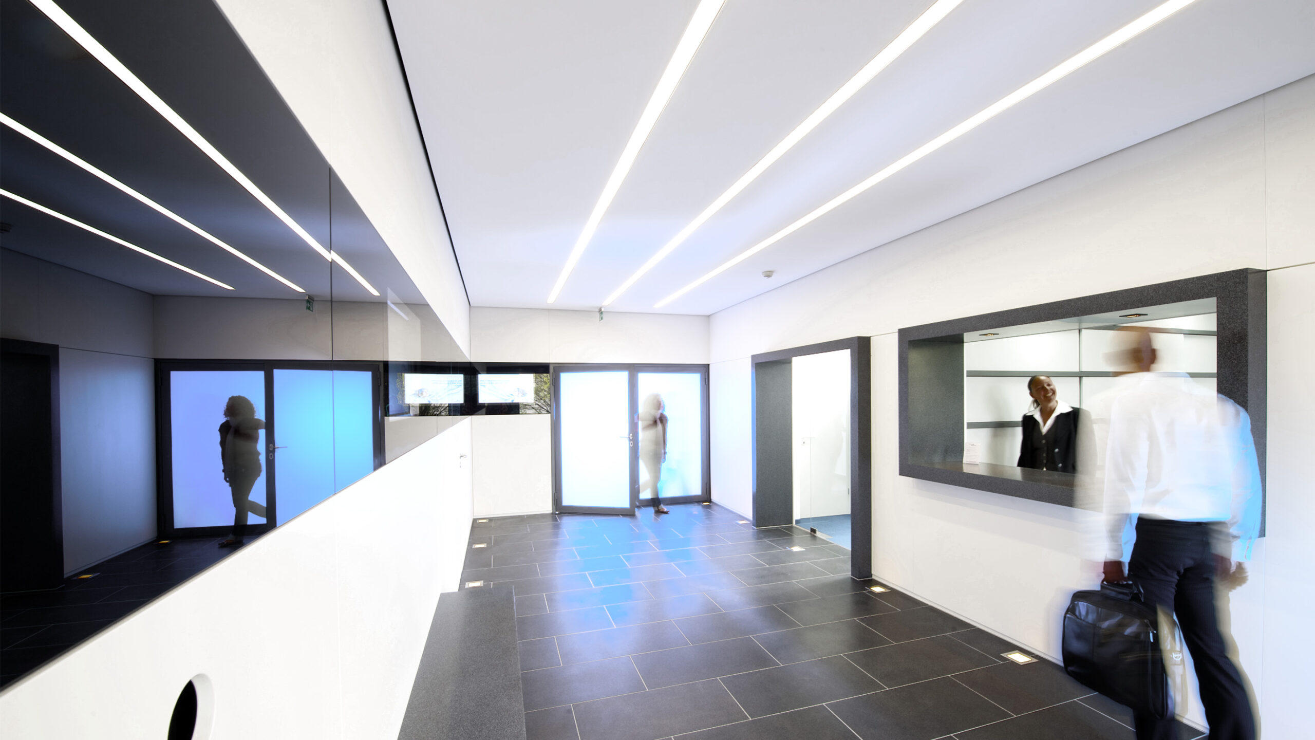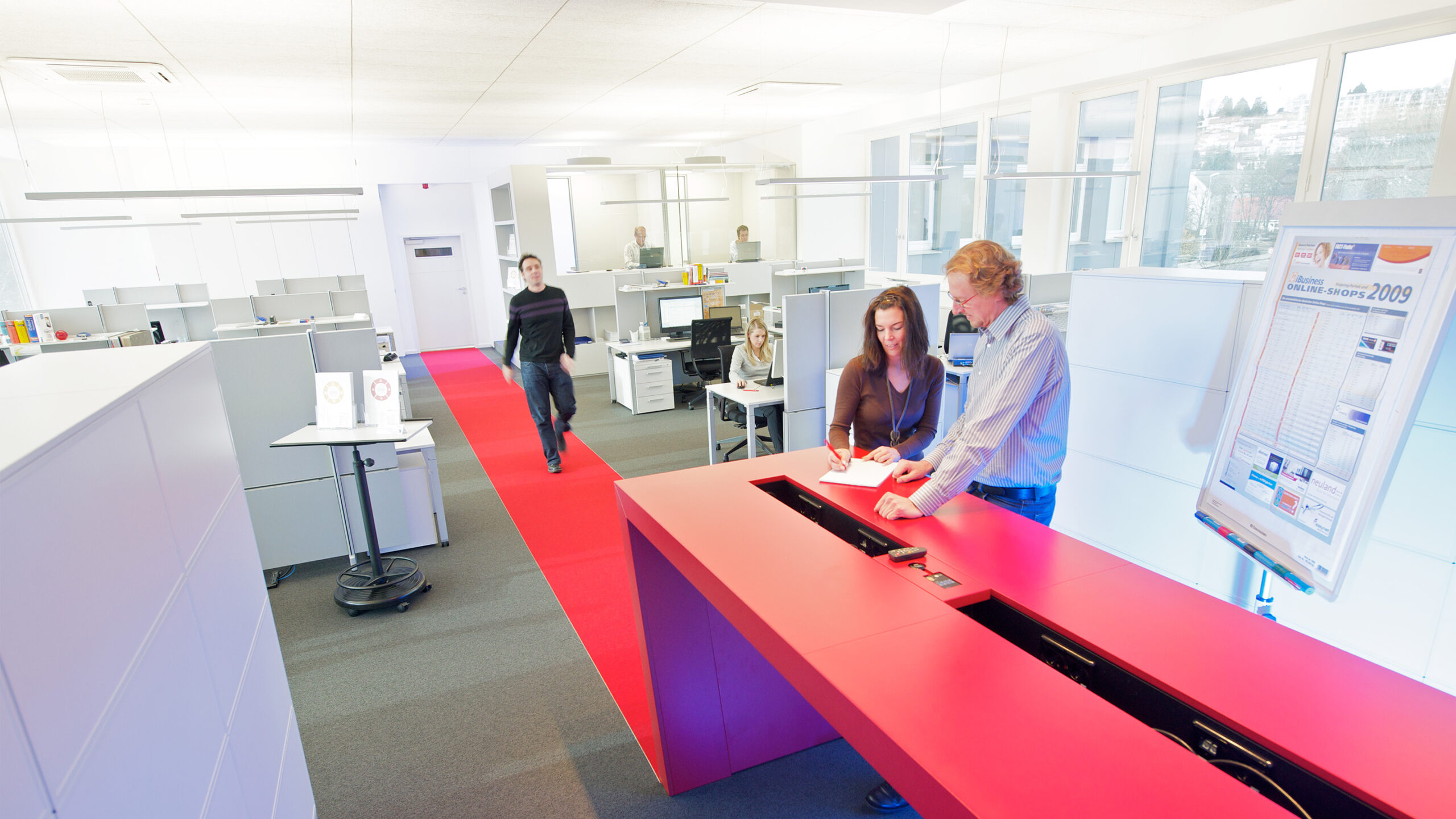 In mehreren Abschnitten wurde das Firmengebäude von 1958 saniert und umgebaut. Hierbei galt es den Charme der ursprünglichen Fassade wiederzubeleben und im Innern die kreativ und innovativ geprägte Atmosphäre eines modernen Medienunternehmens mit 200 Beschäftigten zum Ausdruck zu bringen. Die im Laufe der Jahre angebrachten Werbetafeln und Metallverkleidungen der Hauptfassade wurden entfernt und das filigrane Betonvordach als Eingangssymbol revitalisiert. Im Foyer fällt der Blick aufgrund reduzierter Materialien und Formen auf die farbwechselnden Bodenstrahler und die flächenbündig eingelassenen Monitore, welche die Kernthemen des Unternehmens, Farbe und Kommunikation, zum Ausdruck bringen. In der obersten Etage wird der „Rote Tisch“ prägnanter Treffpunkt zur Schaffung neuer Ideen.