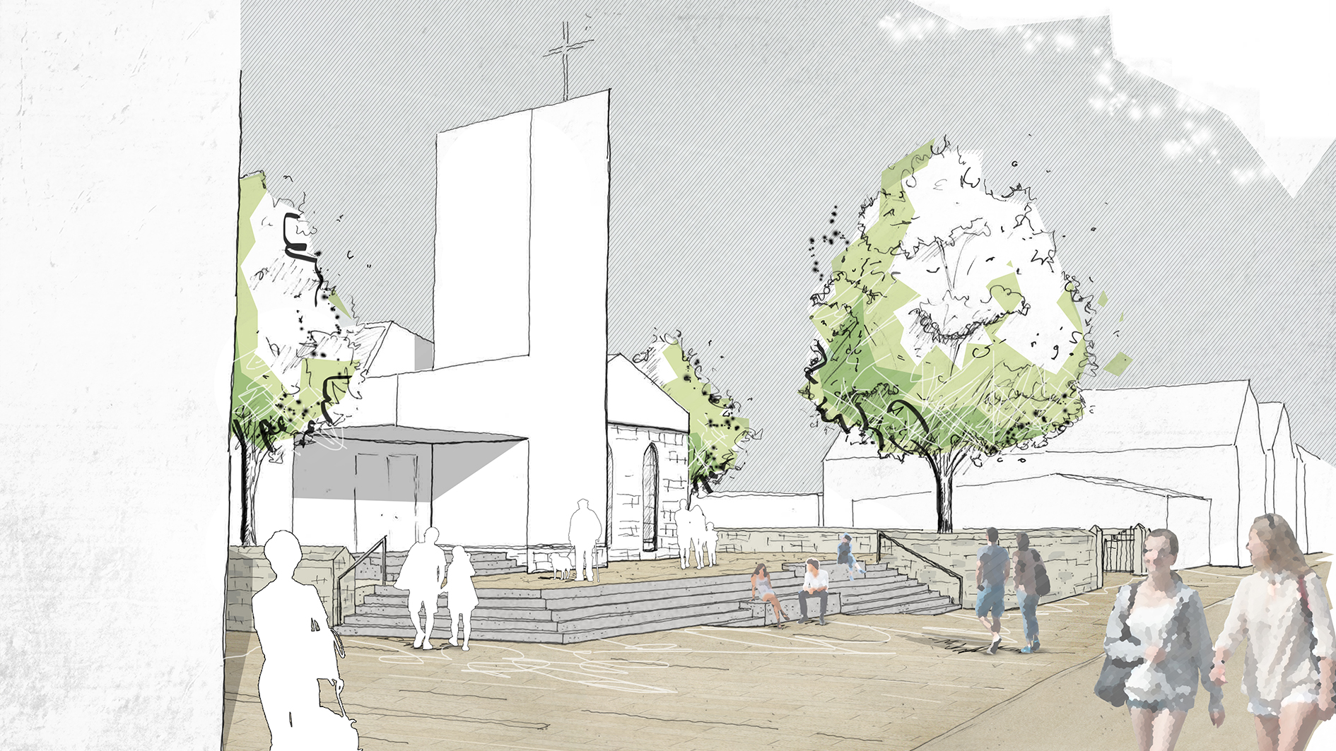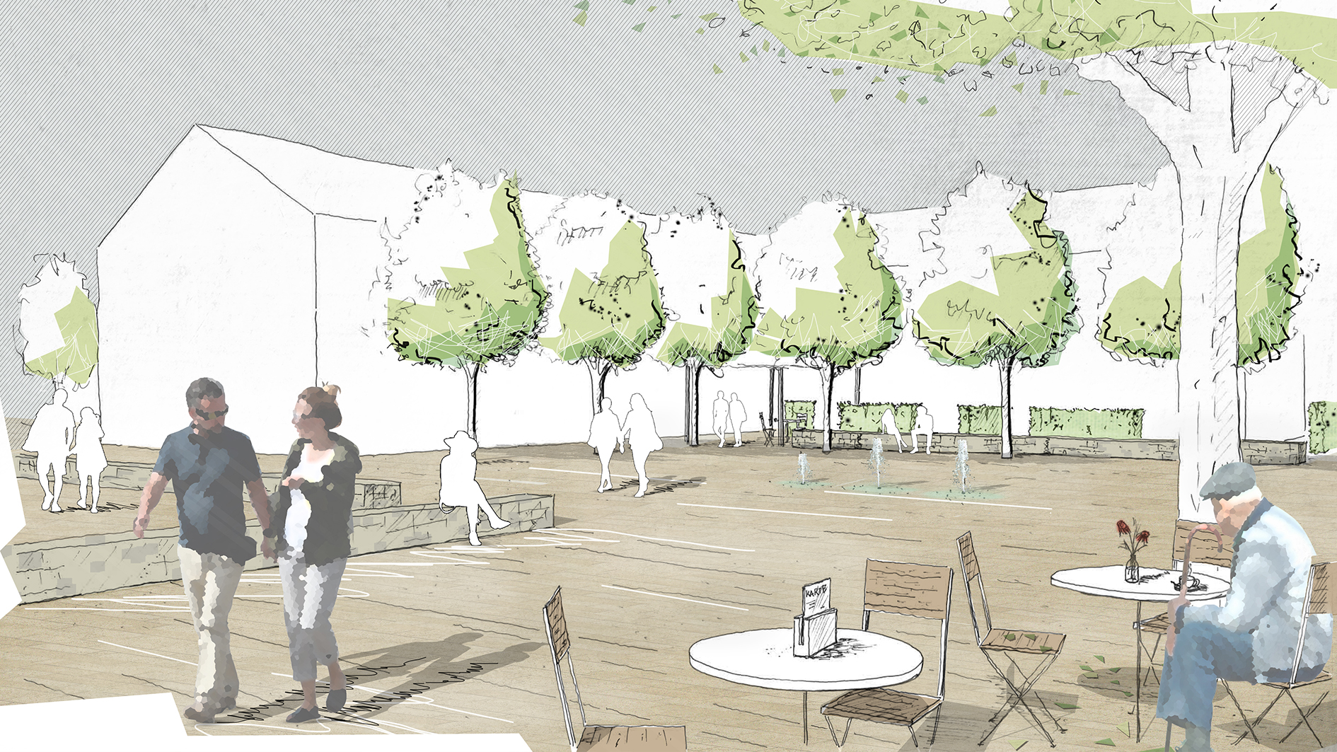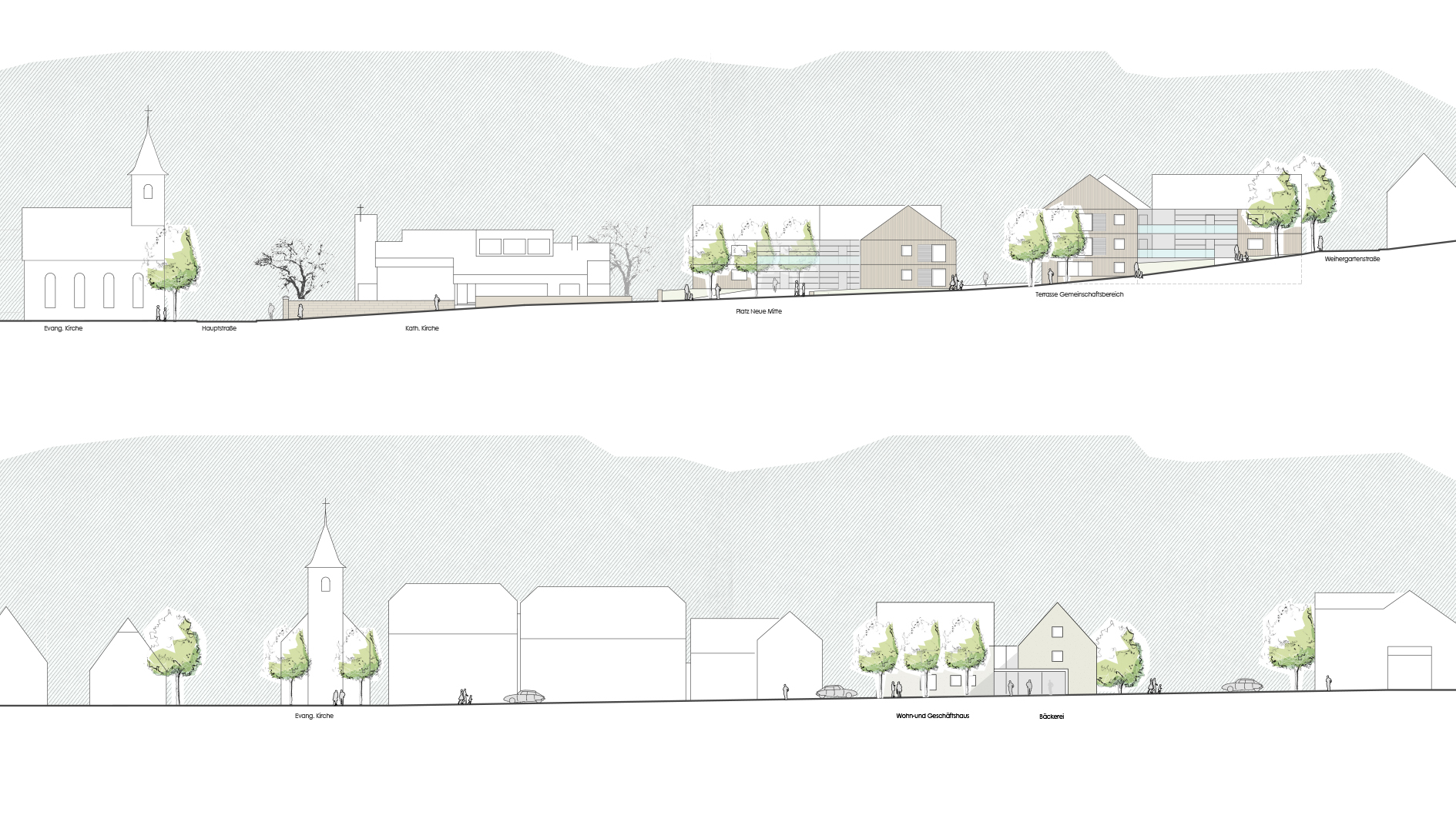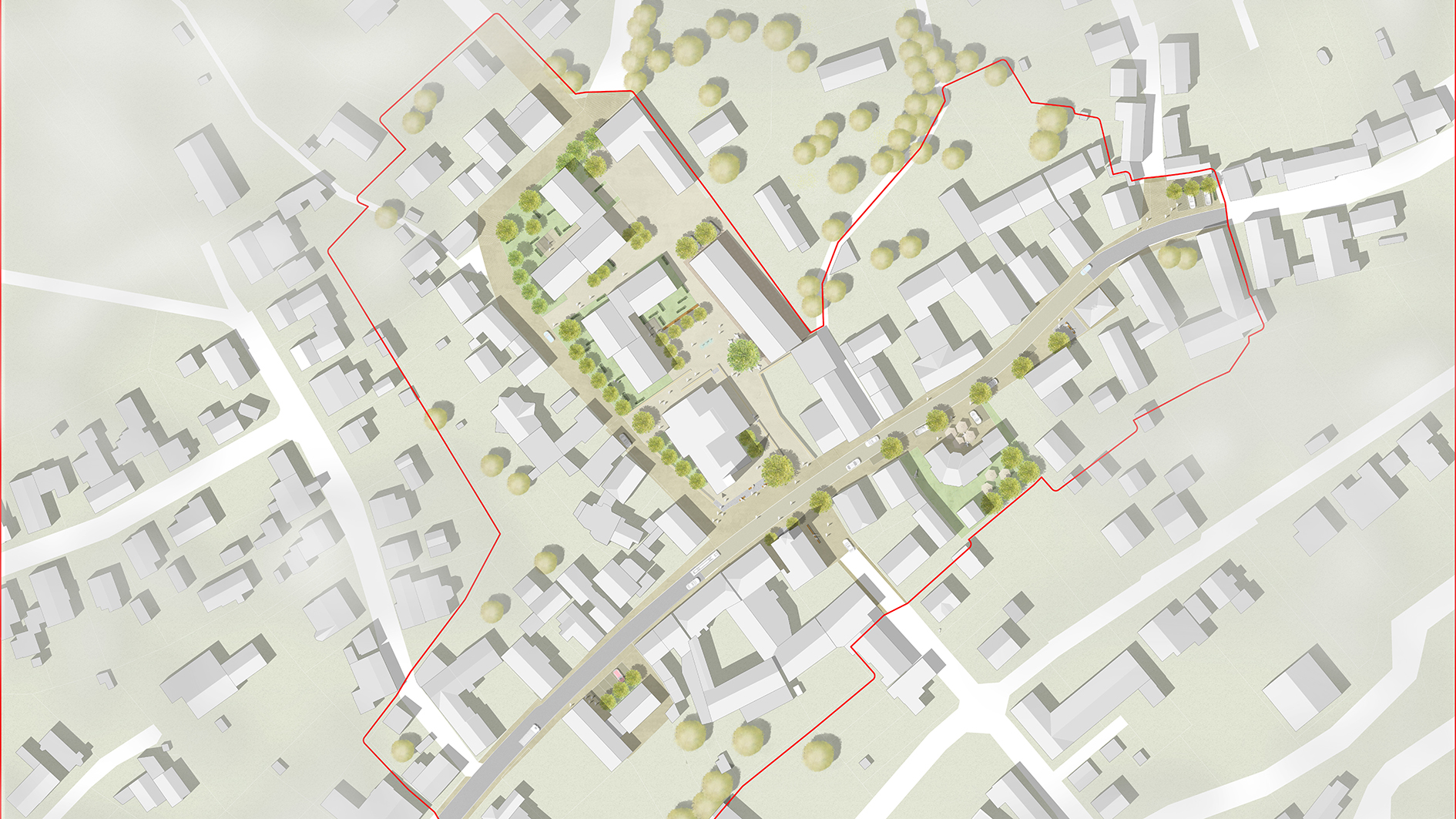 Die dadurch entstehende Verengung des Straßenraumes bildet den Auftakt zur neuen Ortsmitte.