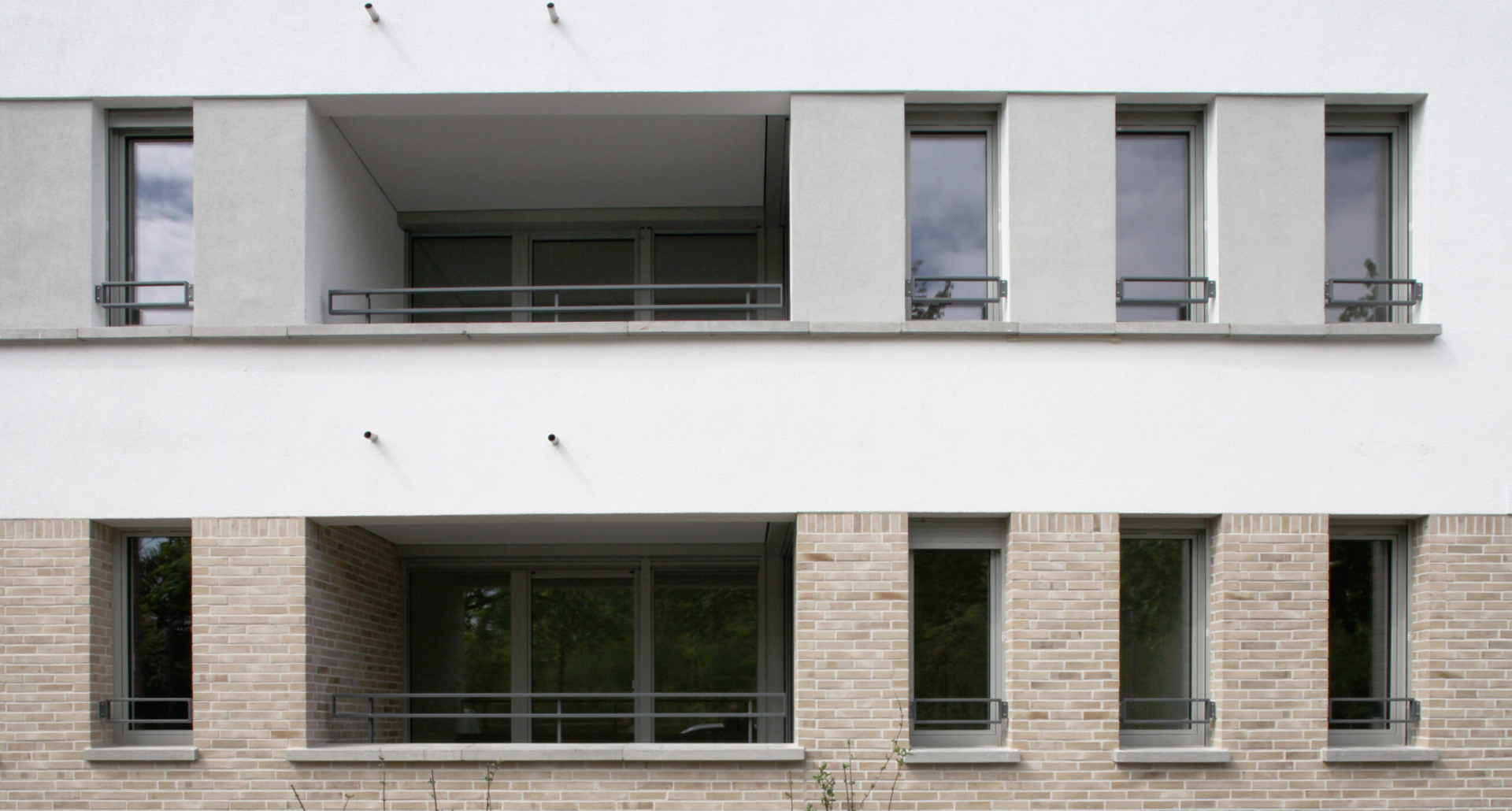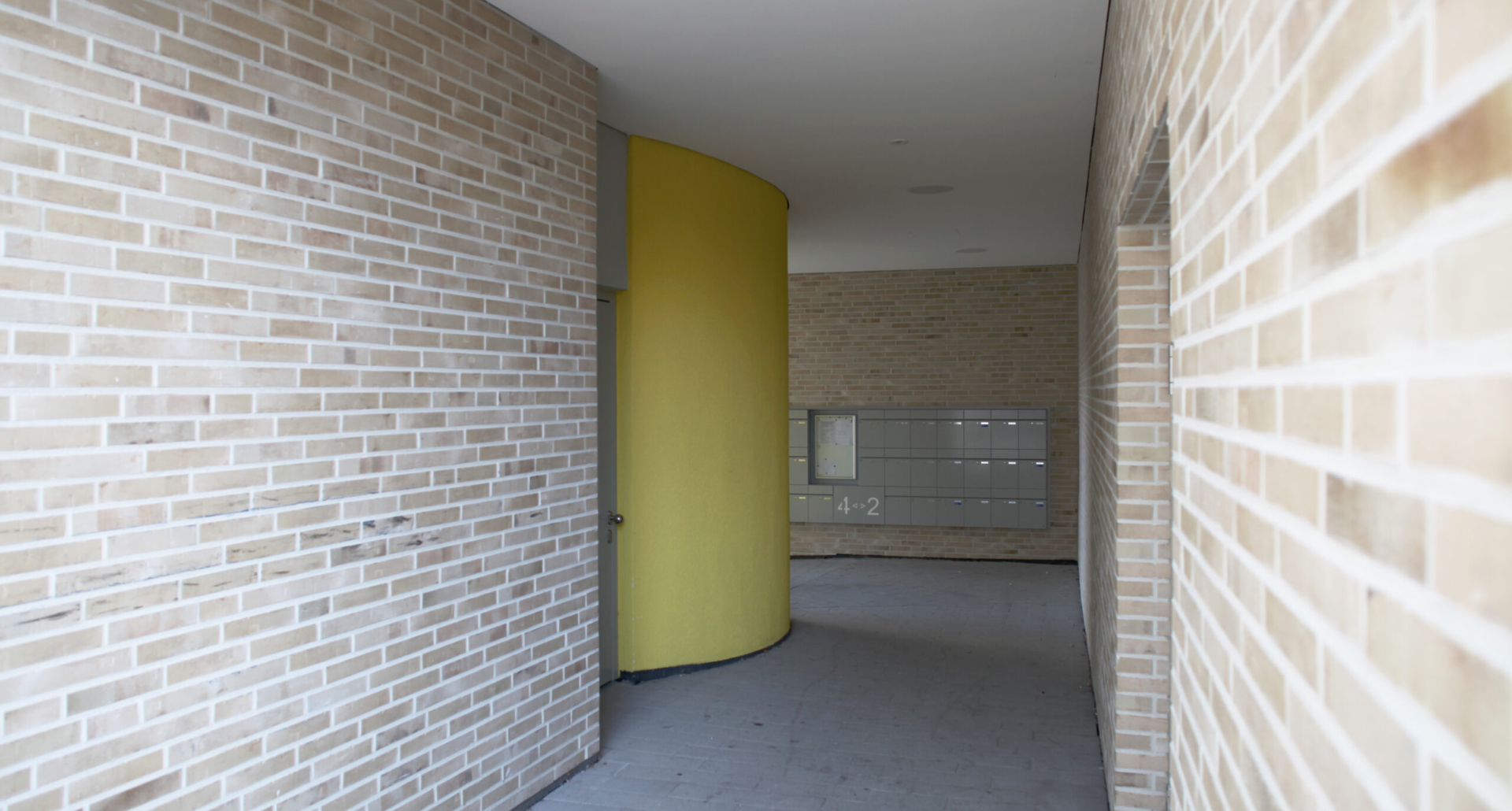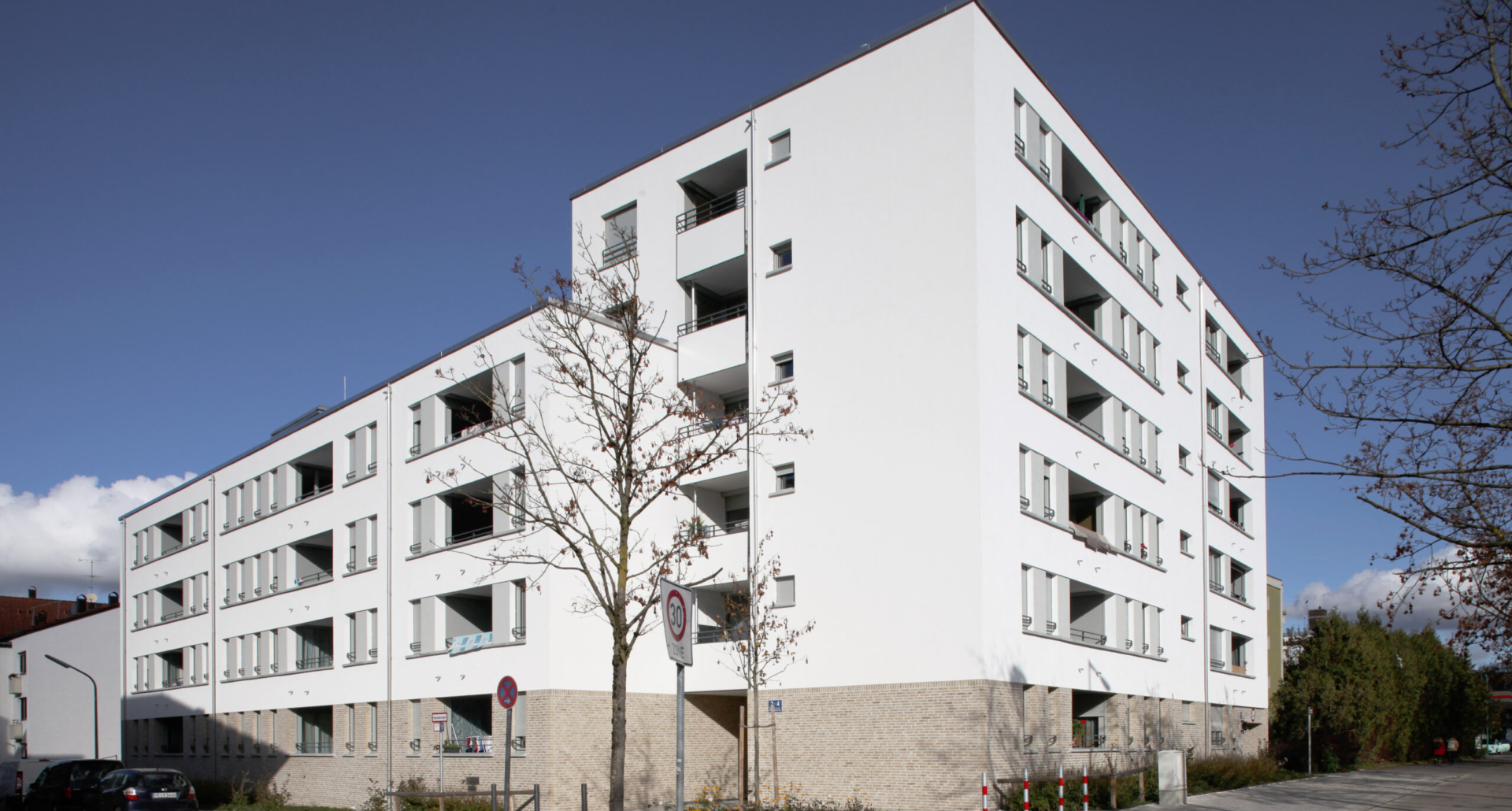 Ein L-förmiger Riegel mit einem Mix aus 1 bis 5-Raum Wohnungen schließt die Bebauung zum Petuelring hin ab und lässt für die Bewohner eine grüne vom Verkehr abgeschottete Innenhofoase entstehen. Der 6-geschoßige Gebäudeteil im Süden schafft einen städtebaulichen Akzent. Die Verschneidung der beiden Riegel bildet den Eingang zum begrünten Innenhof, von wo aus beide Gebäuderiegel erschlossen sind. Die Treppenhäuser werden von einem durchgehenden Luftraum begleitet, welcher über die gesamte Höhe durch ein vertikales Lichtband beleuchtet wird und in Verbindung mit einer hellen Farbgebung für eine freundliche Atmosphäre der vertikalen Erschließungsbereiche sorgt. Ausgeführt wurden die Gebäuderiegel in monolithischer Bauweise. Die Erdgeschosszone ist als Sockelbereich der Fassade verklinkert.
