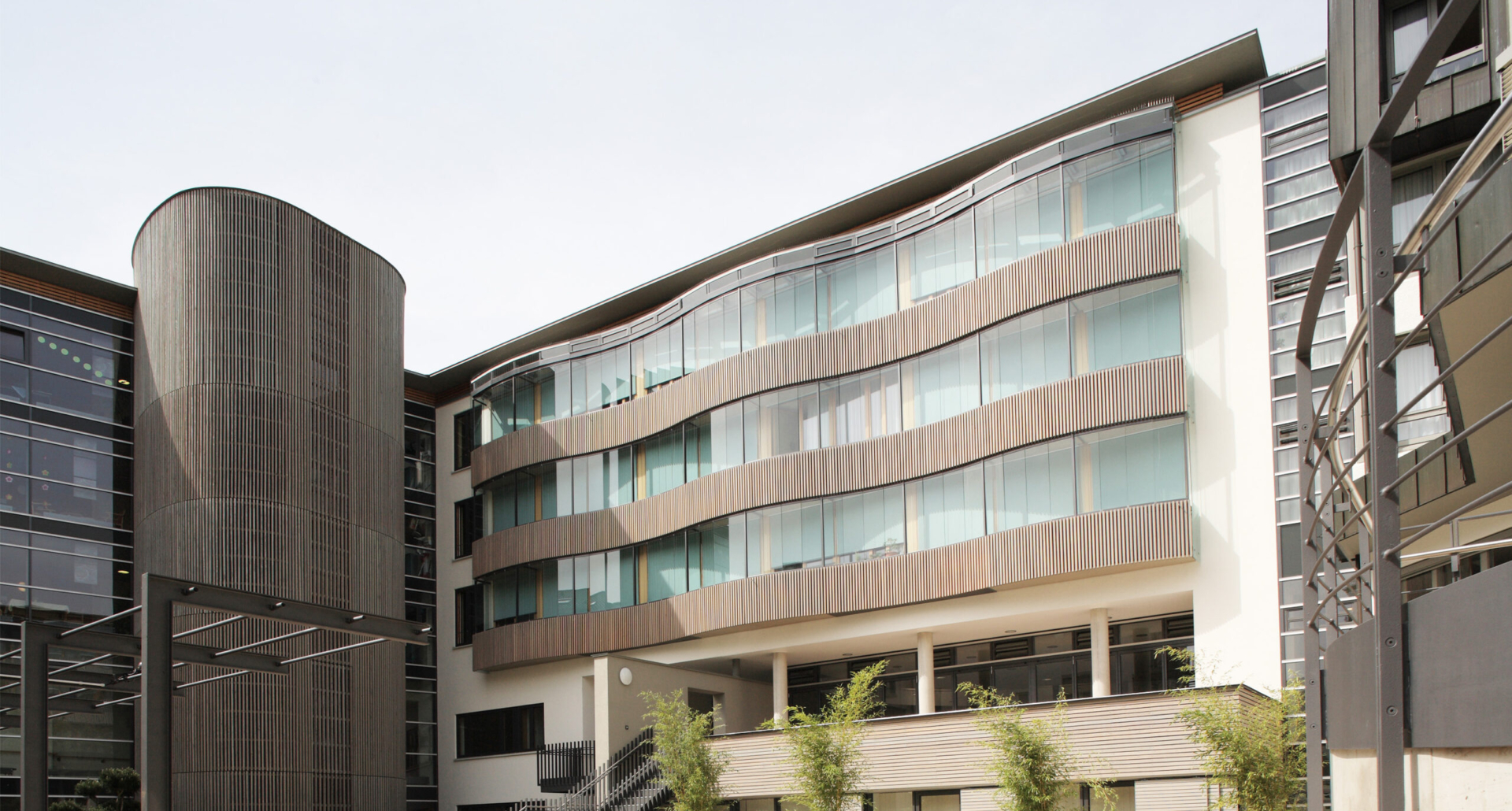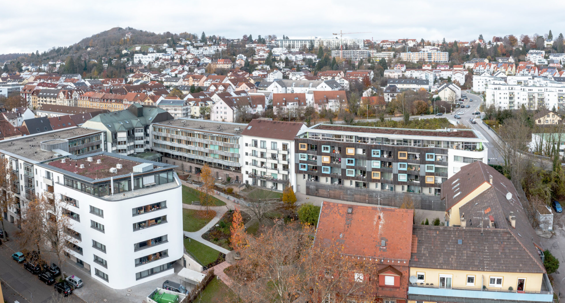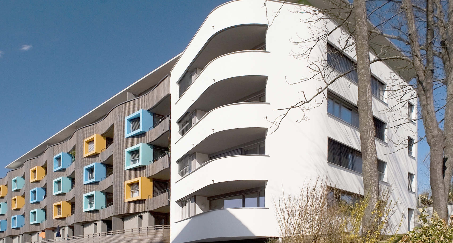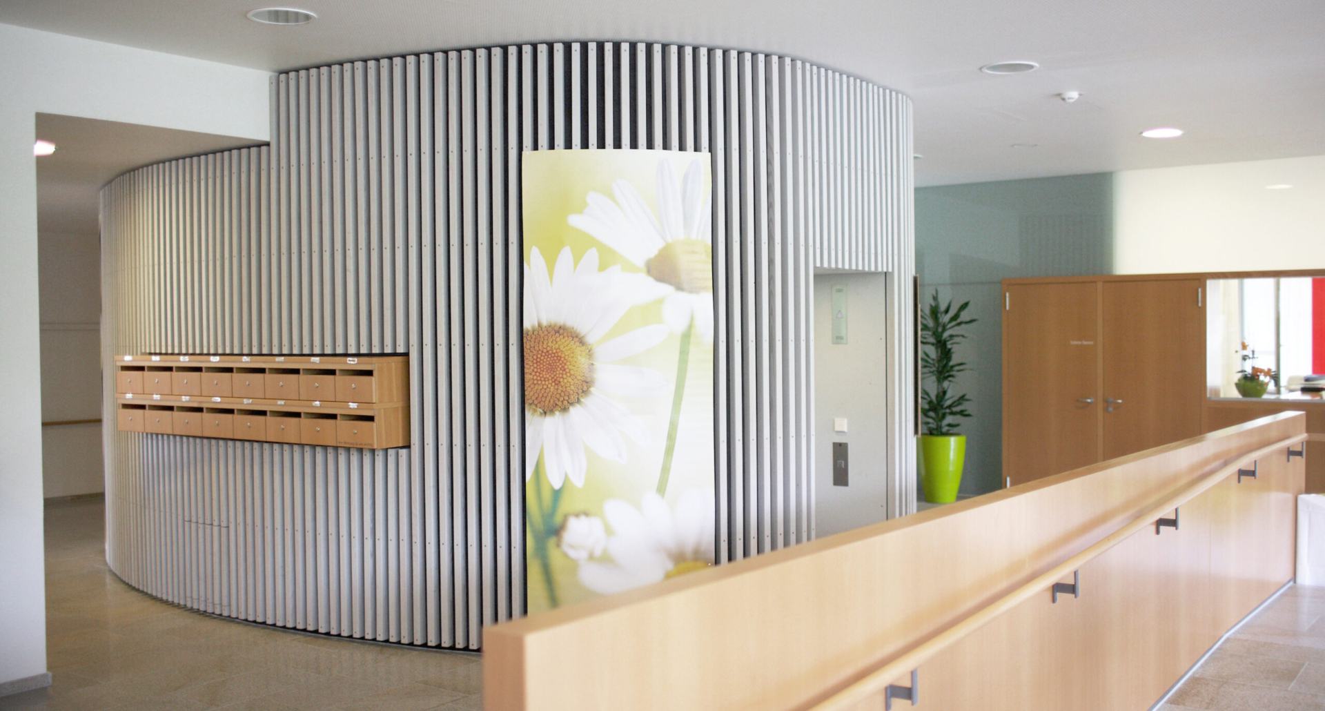 Im Zuge der weiteren Planung wurden die Funktionszusammenhänge der Pflegegeschosse nach den aktuellen Richtlinien optimiert und eine lichtdurchflutete Architektur mit vielfältigen Blickbezügen in den wertvollen Garten geschaffen. Der Gegensatz zwischen geschwungener Glashaut zum begrünten Hof und städtischer Lochfassade zum Straßenraum ist auch im Innern ablesbar und erleichtert den Bewohnern die Orientierung.