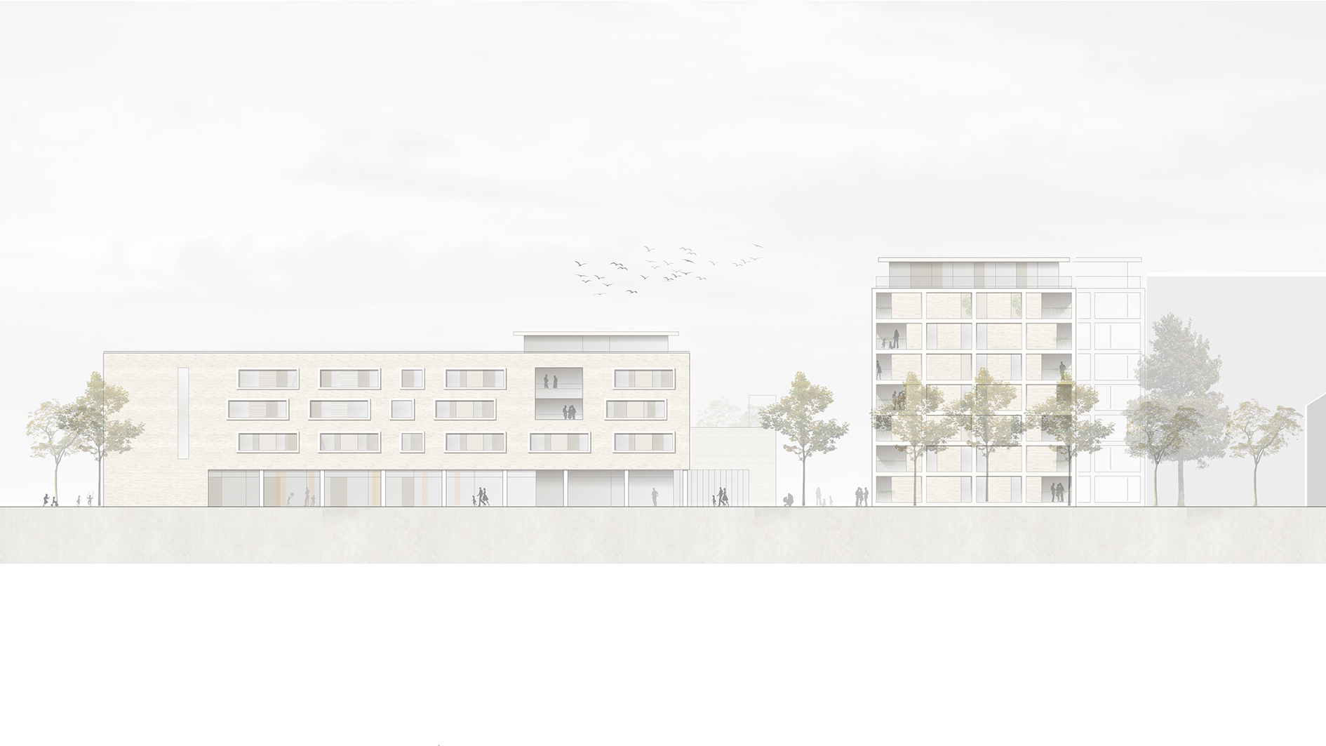 Die Analyse der unterschiedlichen Nutzungen ergab als größte zusammenhängende Geschoßebenen die Fläche von jeweils 2 Pflegegeschossen, welche funktions- und personalschlüsselbedingt nicht auf mehrere Ebenen verteilt werden können. Diese Fläche des Seniorenheimes ist gemeinsam mit Kindergarten und Diakonie L-förmig angeordnet und bildet zur Stadtbahnlinie einen dreieckigen Freibereich, welcher dem Kindergarten als Spielfläche dient. Für die Bewohner des Seniorenheimes ermöglicht ein Dachgarten den Aufenthalt im Freien. Die Unterbringung aller öffentlichen Programme in einem Gebäude ermöglicht den Wohngebäuden eine ungestörte Nutzung.