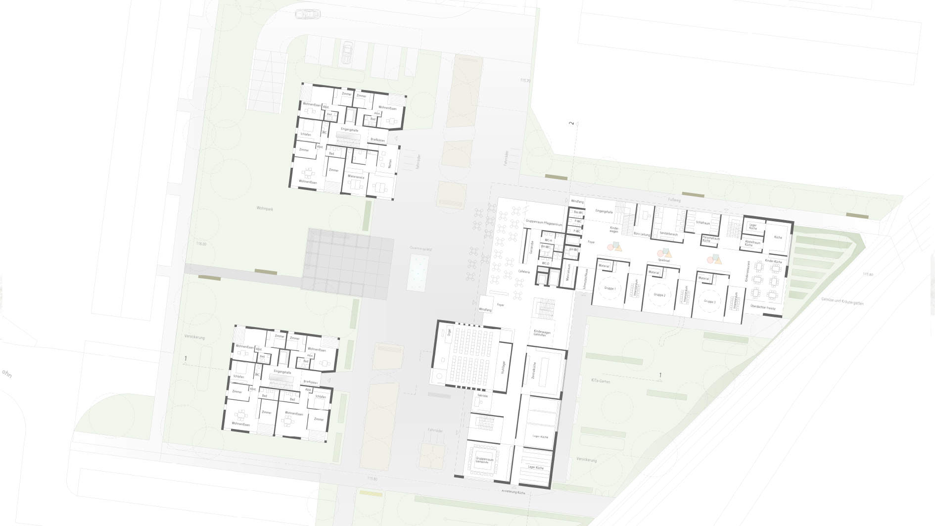 Zentrum des neuen Quartiers ist eine Platzfläche in Anbindung an das Diakonische Zentrum und das Stadtteilbüro. Die innere Platzfläche wird zur Nutzung für verschiedenen Feste und Veranstaltungen freigehalten. Die Fläche des Sprudlerbrunnens ist mit nutzbar. In die östlich angrenzende Parkfläche, in der die Wohnhäuser positioniert sind, greift ein ruhiger Appendix ein. Dieser ‚kleine Platz‘ ist dreiseitig von einer begrünten Pergola gefasst und bietet so im Übergangsbereich vom Platz zum Park einen Aufenthaltsbereich und Treffpunkt mit Bänken und Spielobjekten. Auf der Südseite des platzprägenden Sakralraumes entsteht ein kleiner, eher besinnlicher Hofbereich, der durch eine kreuzförmig angeordnete Säulenbaumgruppe geprägt wird. Hier sind auch Außenveranstaltungen möglich.