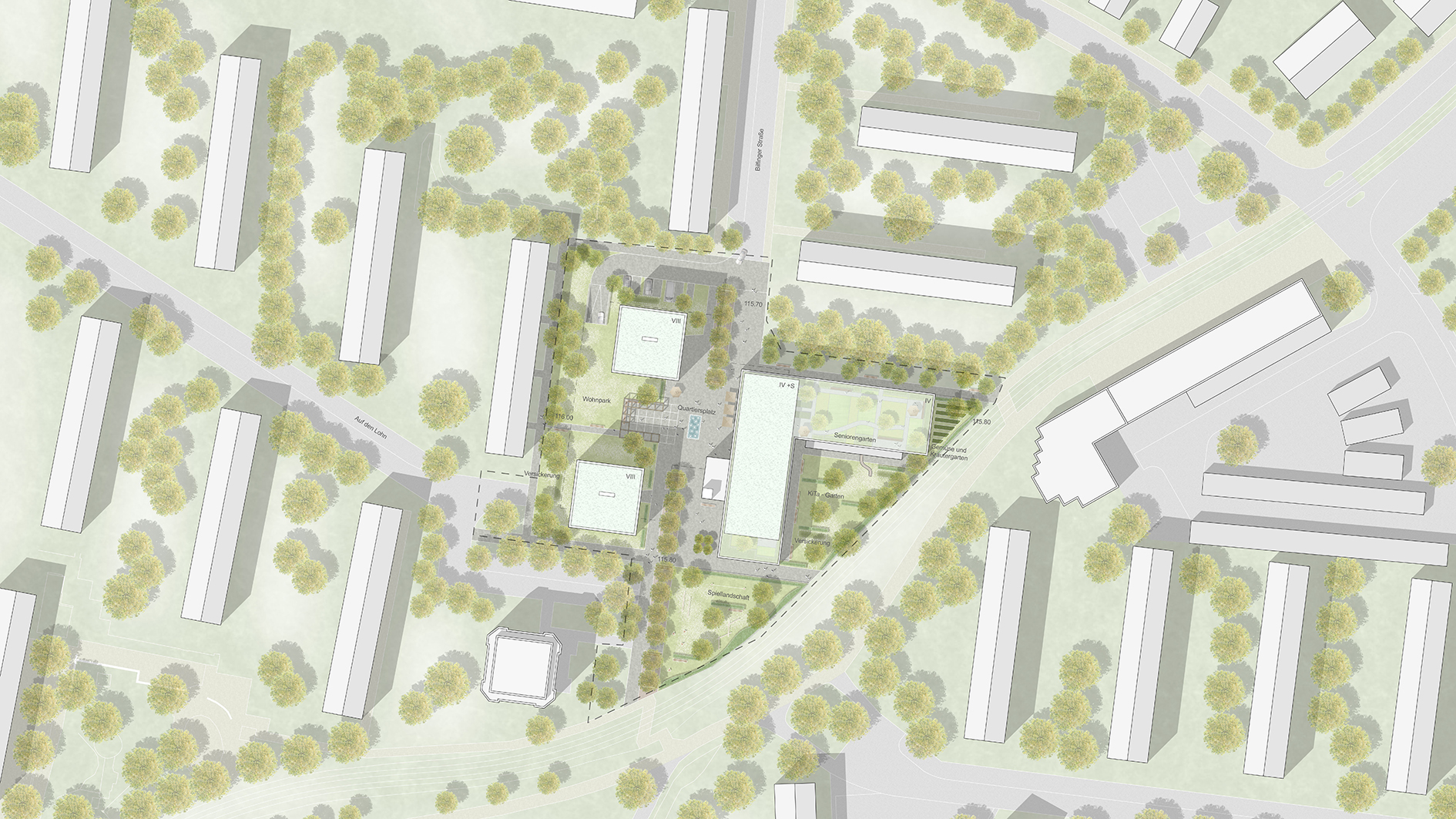 Der heutige Spielplatz südlich des neuen Quartiers wird durch eine Strukturierung durch Hecken und Bäumen in verschiedene Nutzungsbereiche differenziert, in denen vielfältige Spielmöglichkeiten angeboten werden.