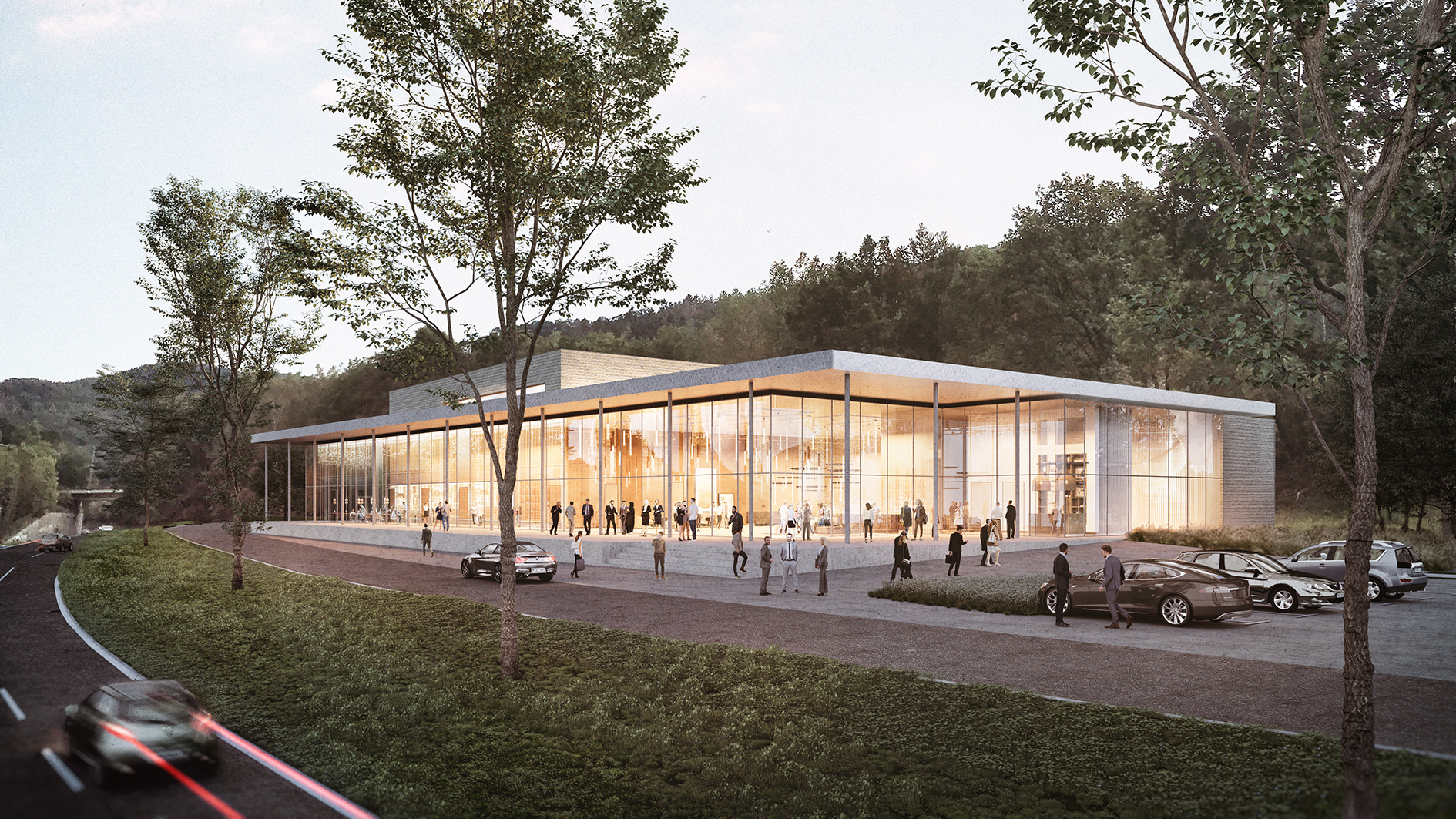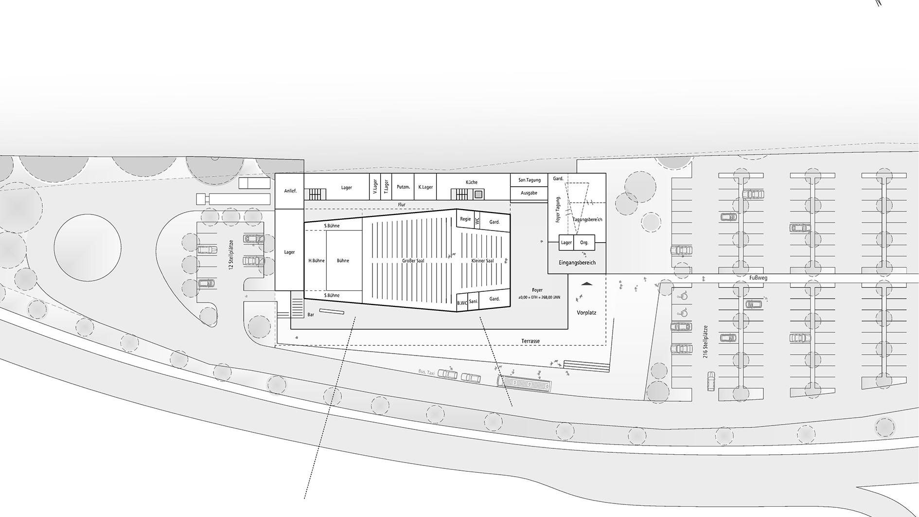 Das Bauvolumen der Stadthalle schiebt sich mit den Nebenräumen in die vorhandene Topografie des Bahndamms. Vorgelagert durchdringt der Saal- und Bühnenbaukörper die Dachebene. Das Foyer orientiert sich zur Straße und bietet über die vorgelagerte Terrasse Ausblicke in die Ausläufer des Rothaargebirges. Zur Stadt hin orientiert sich der Eingangsbereich. Dieser dient als Windfang und Verteiler zwischen Vorplatz, Foyer und Tagungsbereich. Dieser lässt sich mittels flexibler Trennwände in ein weiteres kleines Foyer und zwei Tagungsräumen aufteilen. Der große Saal kann mit dem kleinen Saal verbunden werden und bietet Platz für bis zu 750 Personen bei Reihenbestuhlung oder für bis zu 1200 Personen stehend. Die geschlossenen Außenwandbereiche erhalten eine vorgesetzte Verkleidung aus langgestreckten Klinkern, welche durch Oberflächenbehandlung und Fugenbild eine gebänderte Struktur erzeugen. Über die Zweischaligkeit lassen sich sowohl die energetischen Ziele erreichen als auch Nachhaltigkeit im Sinne von reduzierten Unterhaltskosten und würdiger Alterung der Fassade.